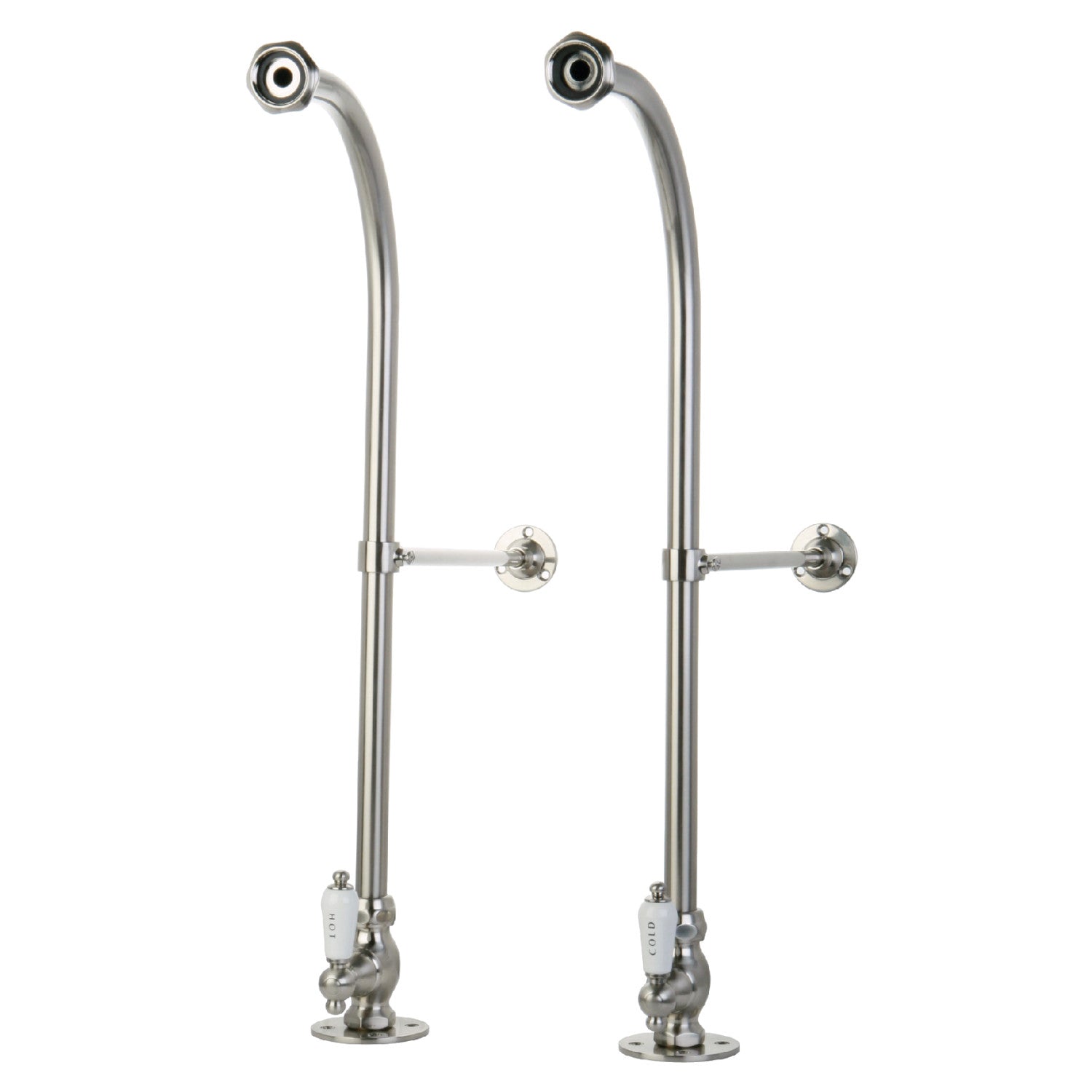 This freestanding water supplies with stop comes in pairs and includes adjustable height wall braces. They are constructed of high quality brass to ensure reliability and durability. Its premier finish resists tarnishing and corrosion.