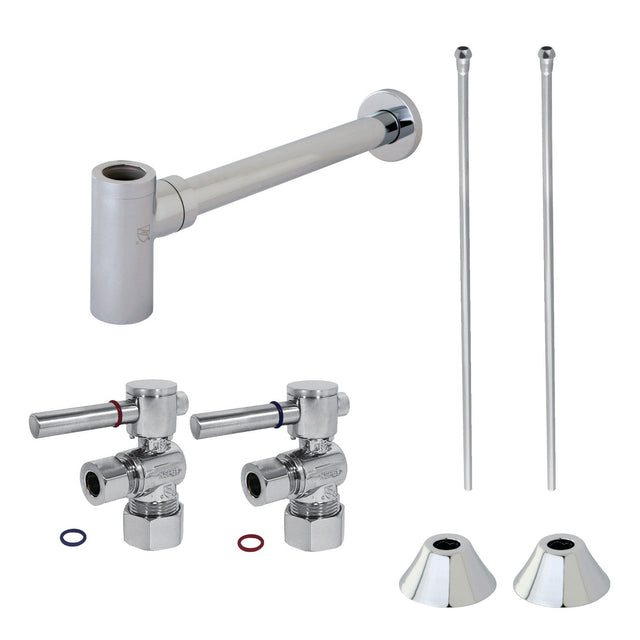 This contemporary themed lavatory/kitchen supply kit features all the components necessary for installing a sink water draining system. The items in this combo include compression angle stops, 30-inch bullnose lavatory supply lines, 1/2" IPS bell flanges, and a sleek 13-7/8" bottle trap. Constructed of high quality material and a tarnish-resistant finish, designed for long-lasting performance. Available in a variety of stunning finishes ready to match any home decor.