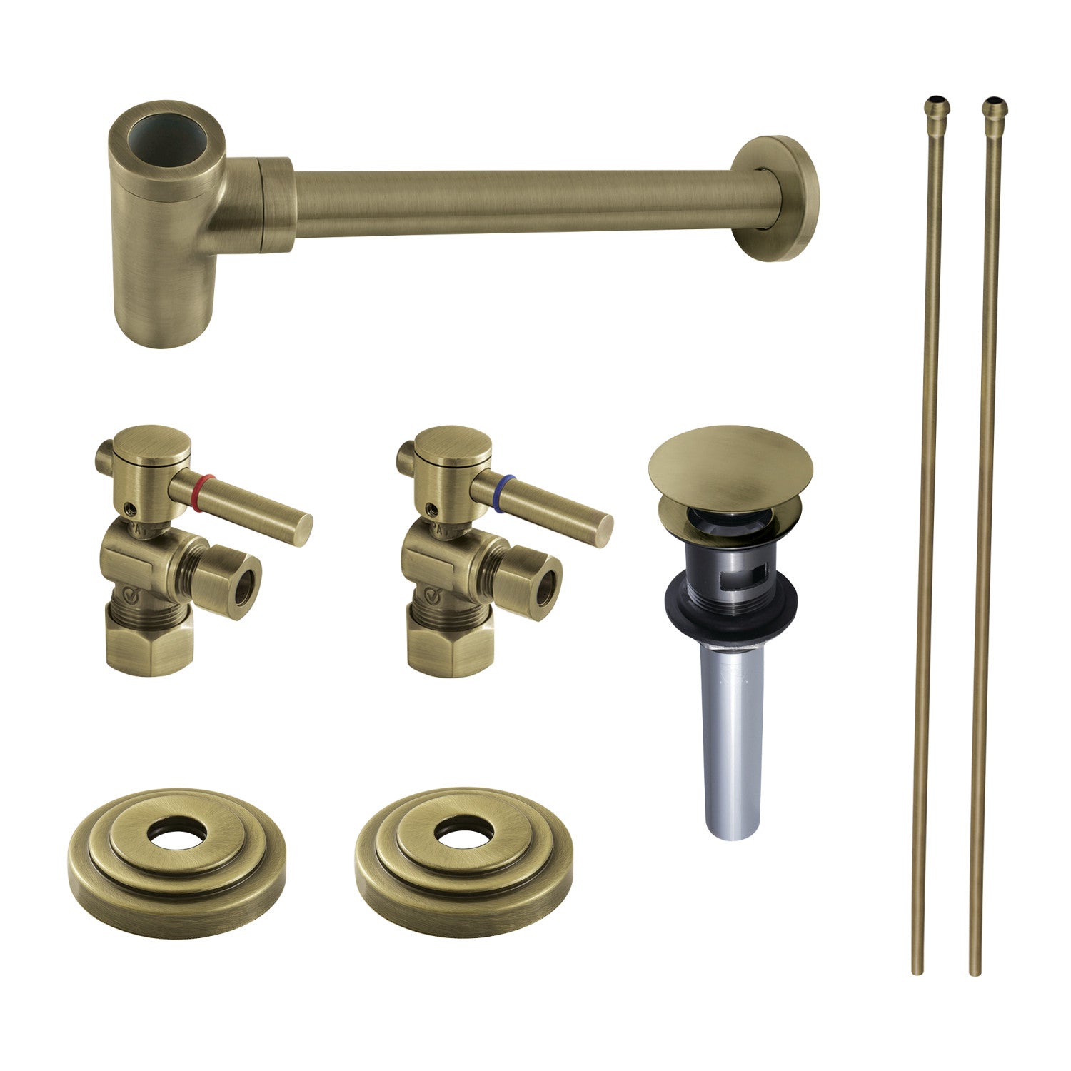 This 8-piece vessel sink plumbing supply kit from Kingston Brass provides all the necessary parts in the water flow process of your vessel sink. The set includes two 1/4 turn hardisc angle stops with lever handles, two 30" bullnose supply line, two contemporary decorative flanges, a contemporary 1-1/4" OD decorative bottle-trap and a 22 gauge 1-1/4" vessel sink drain with overflow. Constructed of high quality brass and a tarnish-resistant finish, designed for long-lasting performance. Available in a variety of stunning finishes ready to match any home decor.