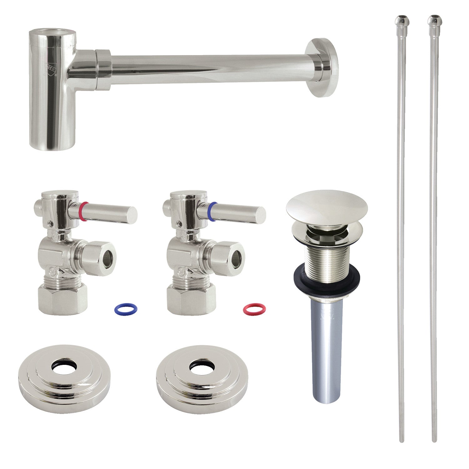 This 8-piece vessel sink plumbing supply kit from Kingston Brass provides all the necessary parts in the water flow process of your vessel sink. The set includes two 1/4 turn hardisc angle stops with lever handles, two 30" bullnose supply line, two contemporary decorative flanges, a contemporary 1-1/4" OD decorative bottle-trap and a 22 gauge 1-1/4" vessel sink drain without overflow. Constructed of high quality brass and a tarnish-resistant finish, designed for long-lasting performance. Available in a variety of stunning finishes ready to match any home decor.
