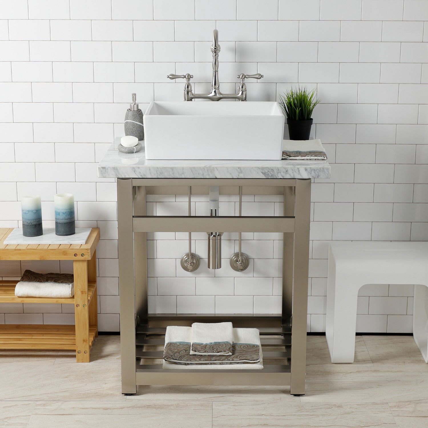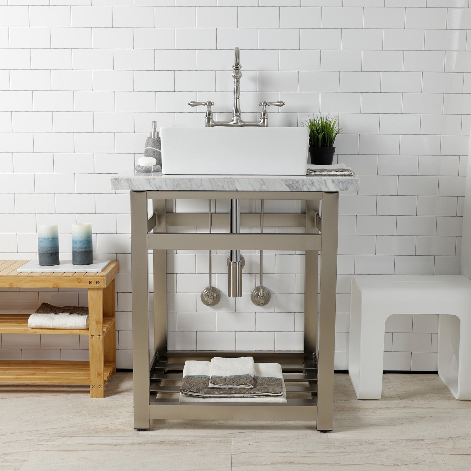 This 8-piece vessel sink plumbing supply kit from Kingston Brass provides all the necessary parts in the water flow process of your vessel sink. The set includes two 1/4 turn hardisc angle stops with lever handles, two 30" bullnose supply line, two contemporary decorative flanges, a contemporary 1-1/4" OD decorative bottle-trap and a 22 gauge 1-1/4" vessel sink drain without overflow. Constructed of high quality brass and a tarnish-resistant finish, designed for long-lasting performance. Available in a variety of stunning finishes ready to match any home decor.