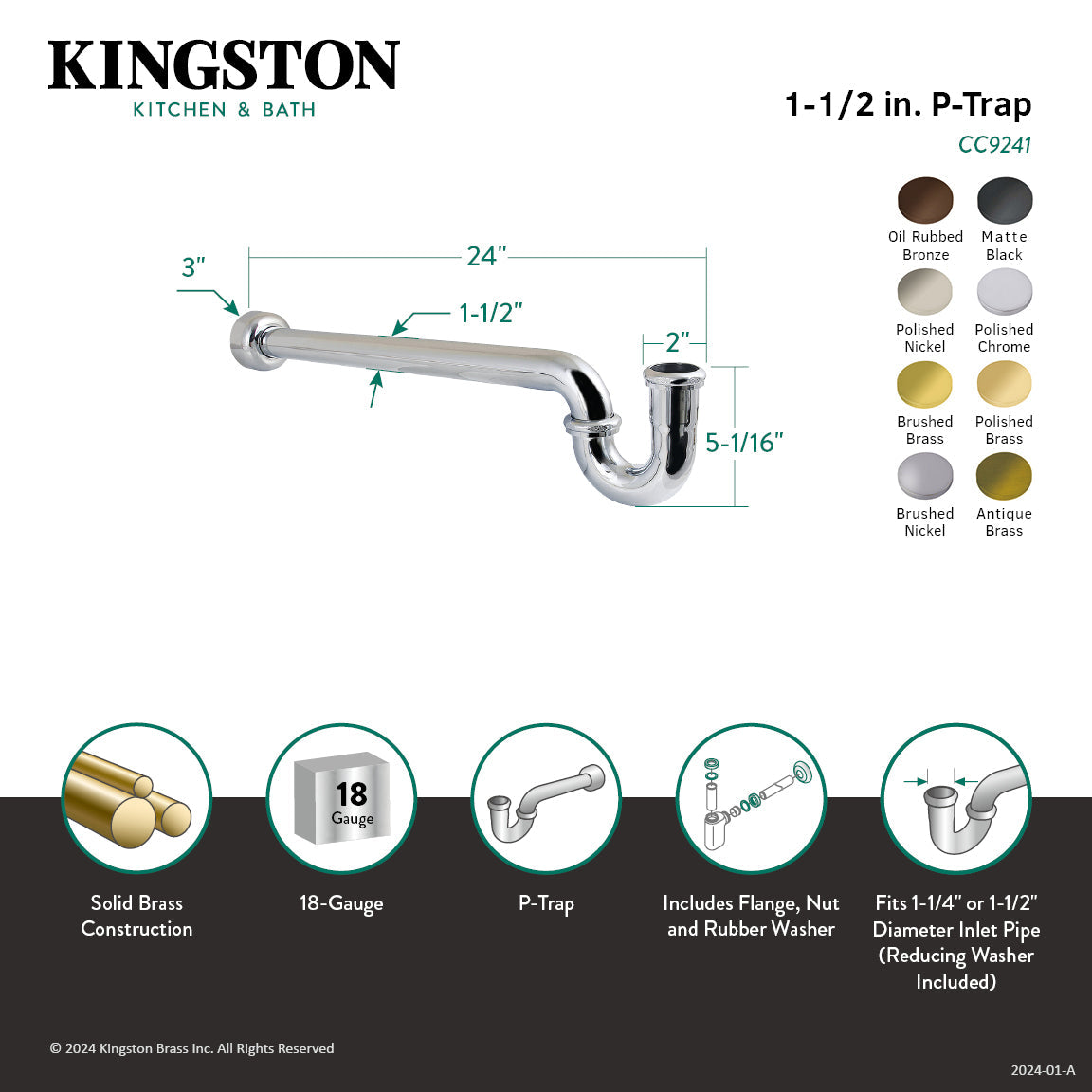 Ideal for homes with exposed plumbing, Kingston Brass decorative P-Traps offer a wide range of premium finishes that seamlessly complement your existing bathroom fixtures. Whether your bathroom has a modern or traditional style, these P-Traps are available in various finishes, ensuring a perfect match. Beyond their aesthetic appeal, these P-Traps serve a vital function by providing a liquid seal between your home and sewer gases. This essential feature prevents any potential contamination from entering your living space, ensuring a safe and hygienic environment. Crafted from durable 18-gauge brass, this 1-1/2" P-trap ensures reliable and long-lasting performance for many years to come. Its sturdy construction guarantees trouble-free operation, providing you with the confidence and peace of mind that your plumbing system is built to withstand the test of time. This P-trap features a HI-box flange, adding a finishing touch to achieve a polished and complete look; with this thoughtful design element, you can enjoy a well-coordinated and stylishly finished sink installation. This P-trap can be fitted to a 1-1/4" pipe with the included reducing washer (white washer).