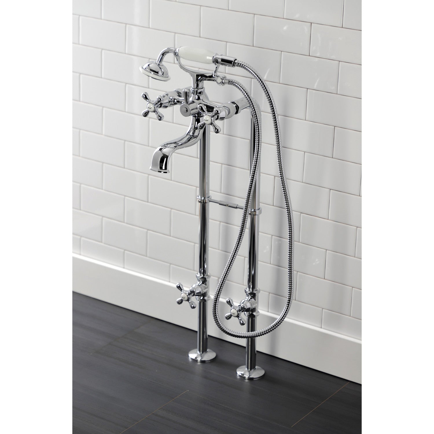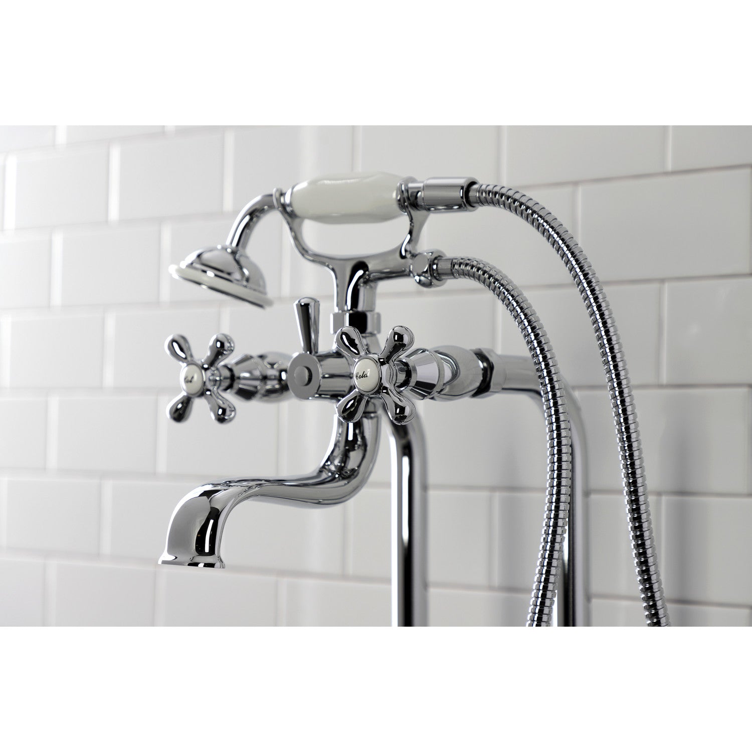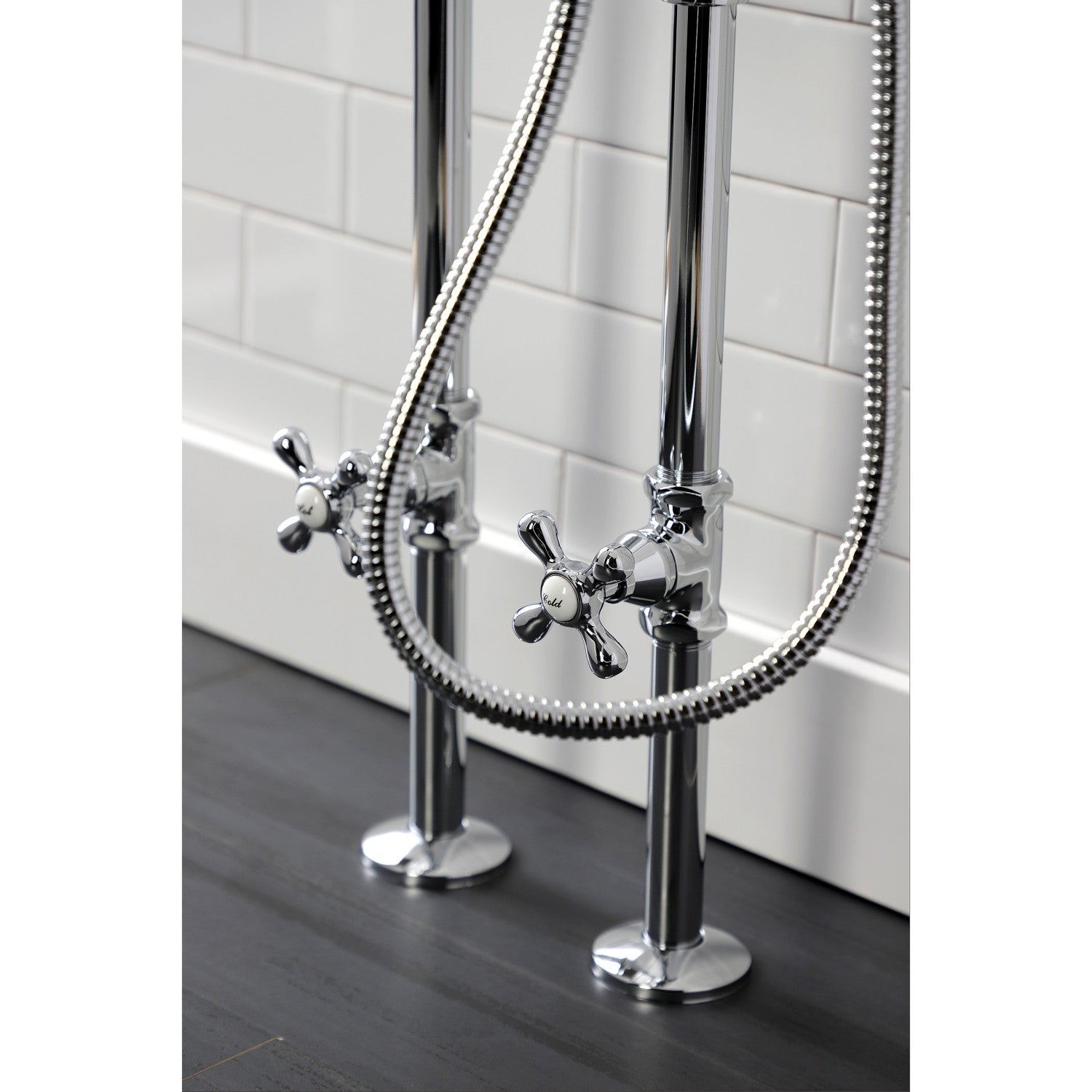 Distinguished for its elegance, sophistication, and exquisite architecture, this freestanding tub faucet is the perfect fixture for any traditional home. Allow it to both complement your freestanding tub and act as a beautiful ornamental piece in your bathroom. As the perfect accompaniment to your tub, the Kingston freestanding clawfoot tub faucet with water supply lines and valves will surely complete your refined bathroom decorum with the help of its premium, glistening polished chrome finish and hand shower. The solid brass construction also makes for a heavy, quality made product. Includes hand shower with porcelain handle and 59-inch hose.