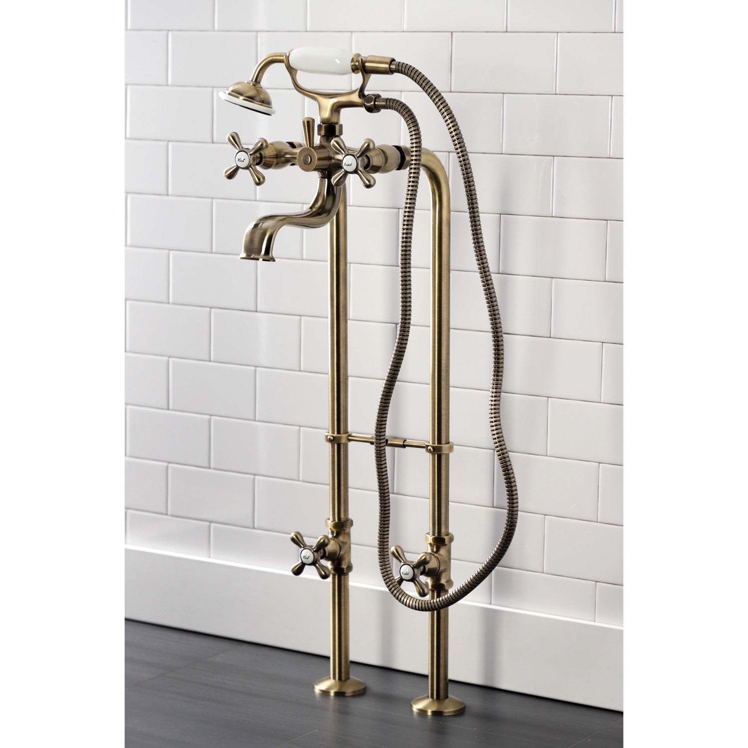 Distinguished for its elegance, sophistication, and exquisite architecture, this freestanding tub faucet is the perfect fixture for any traditional home. Allow it to both complement your freestanding tub and act as a beautiful ornamental piece in your bathroom. As the perfect accompaniment to your tub, the Kingston freestanding clawfoot tub faucet with water supply lines and valves will surely complete your refined bathroom decorum with the help of its premium, glistening antique brass finish and hand shower. The solid brass construction also makes for a heavy, quality made product. Includes hand shower with porcelain handle and 59-inch hose.