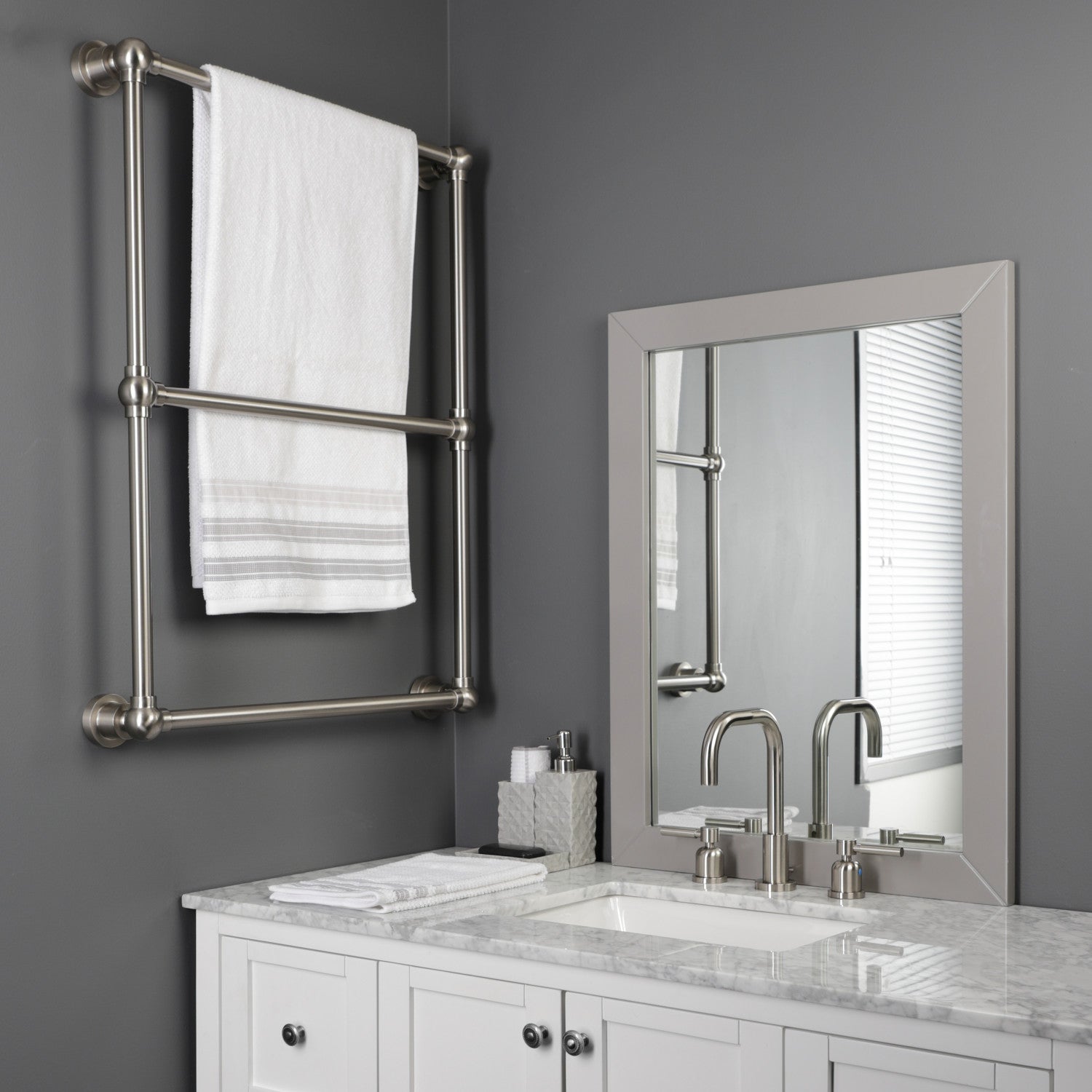 Maximize your towel hanging space with the addition of this elegant ladder type towel rack. Its 3 horizontal levels will provide you with 72" of towel hanging space while only using 5 square feet of wall space. Available in many finishes to match your bathroom decor.