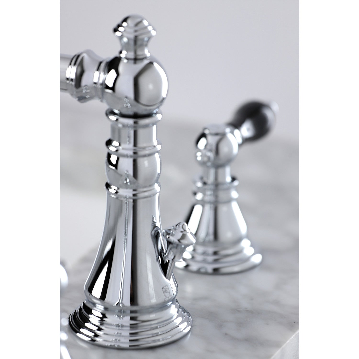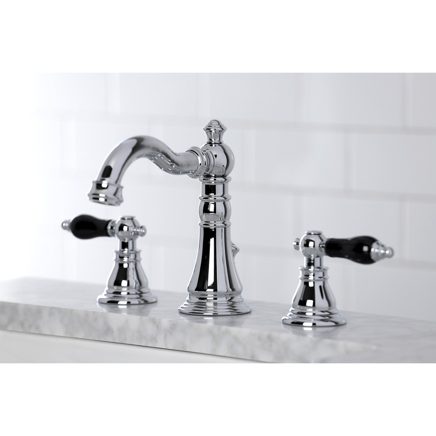 Crafted in commendations to English nobility, the exemplary design of this faucet manifests regality and elegance with its black porcelain handles. Ideal for more spacious bathrooms, widespread faucets are more spread apart and feature a 3-hole installation. The Duchess widespread bathroom faucet and its featured sturdy brass construction and premium polished chrome finish are guaranteed to glamorize your home's traditional ensemble for years to come. Glamorize your home today with the traditional elegance of this faucet. A matching finish drain is also included.