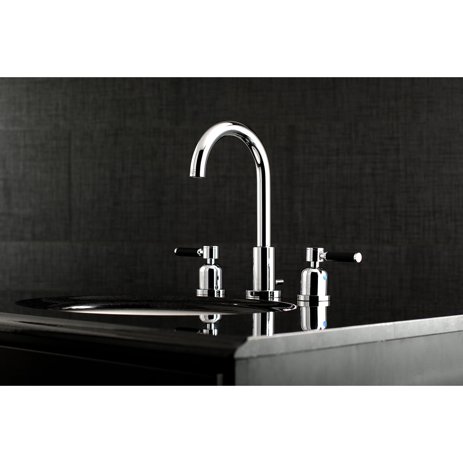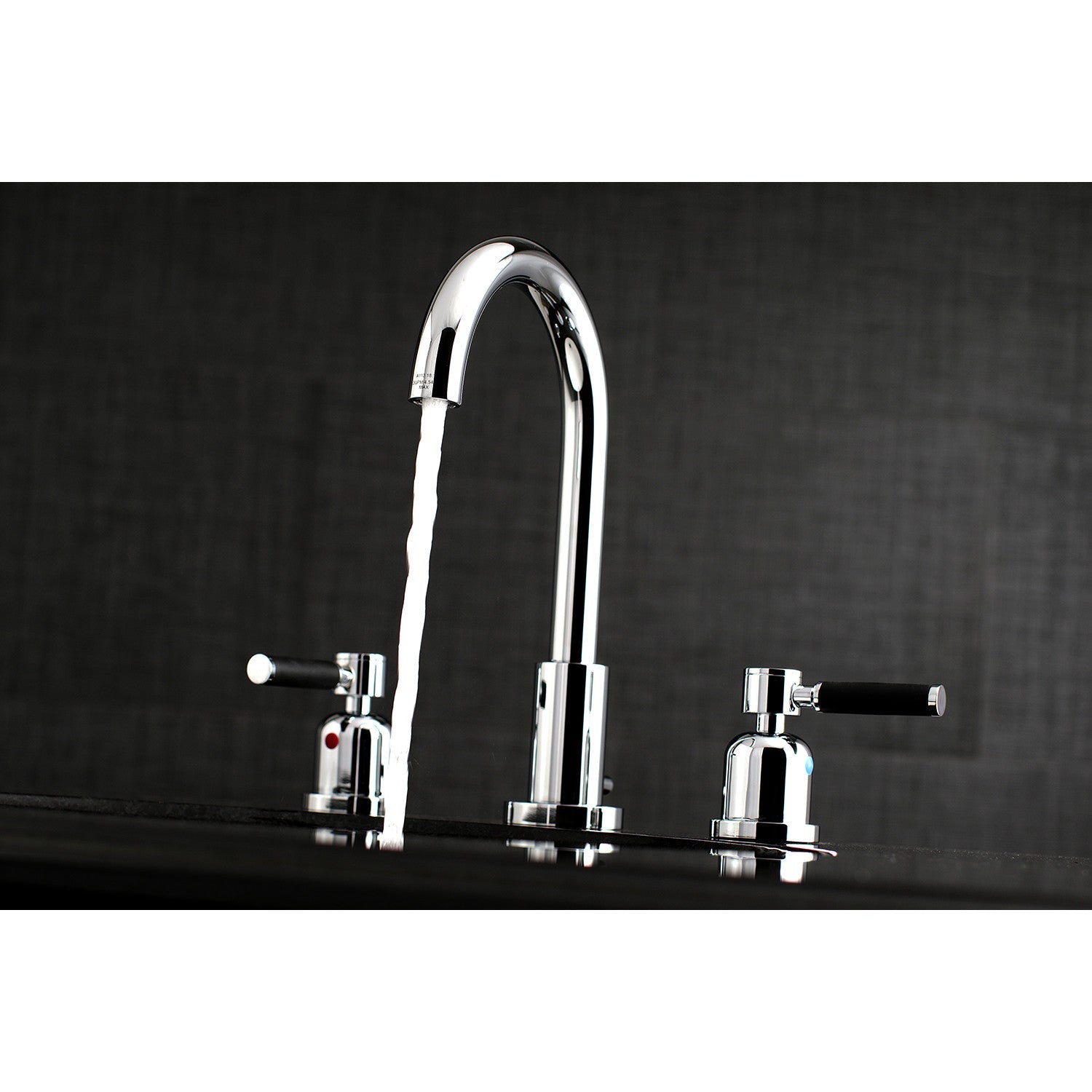 This faucet tastefully interweaves top-notch ergonomic design and the sheen of contemporary simplicity with its black silicone rubber coated handles and cylindrical facets. Ideal for more spacious bathrooms, widespread faucets are more spread apart and feature a 3-hole installation. The Kaiser 8 in. widespread bathroom faucet with brass pop-up and its featured sturdy brass construction and premium polished chrome finish are guaranteed to glamorize your home's modern ensemble for years to come. Furnish your home surrounding with the modern flair of this fixture. A matching finish drain is also included.