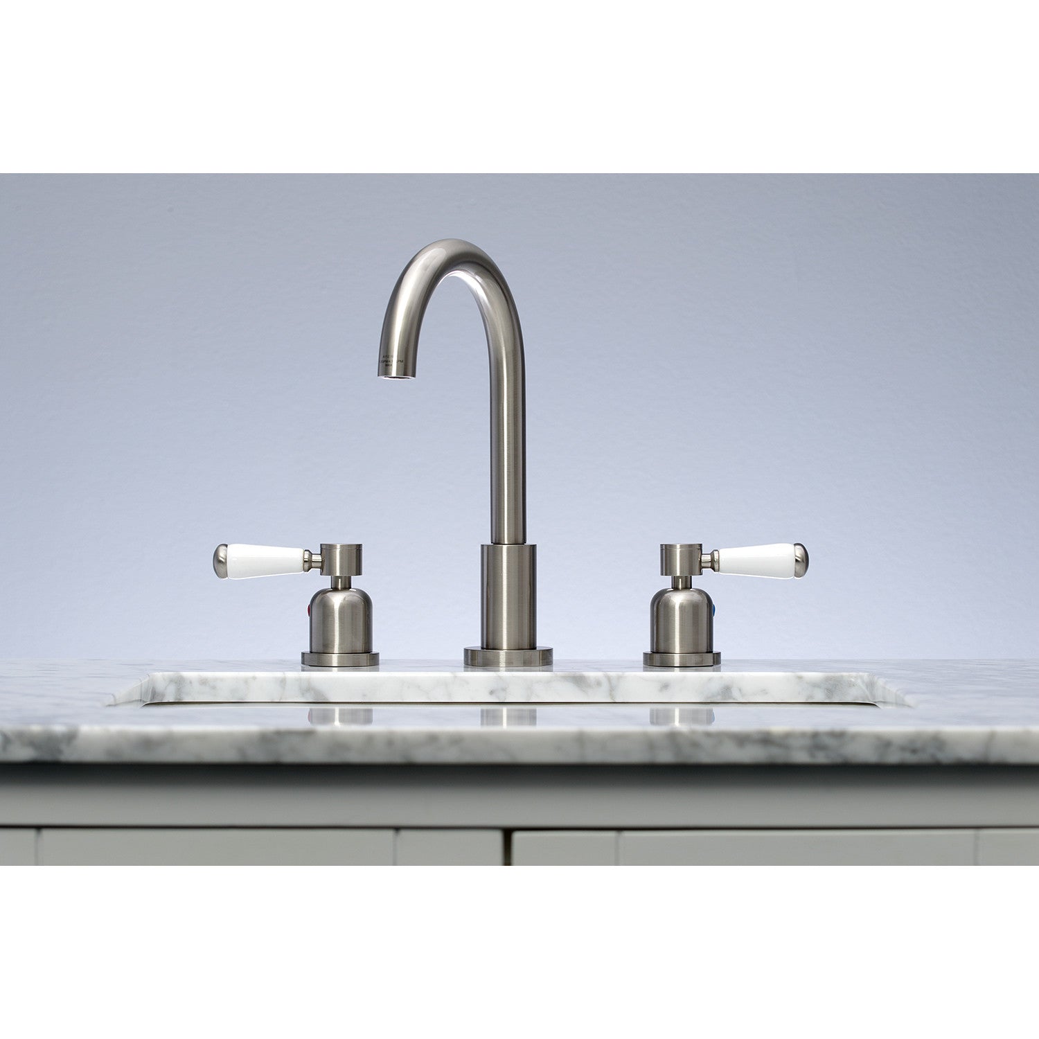 Crafted to bring aesthetic beauty alongside exceptional performance, the feature of porcelain lever handles and rounded architecture solidifies pristine refinement in this faucet. Ideal for more spacious bathrooms, widespread faucets are more spread apart and feature a 3-hole installation. The Paris 8 in. widespread bathroom faucet with brass pop-up and its featured sturdy brass construction and premium brushed nickel finish are guaranteed to glamorize your home's modern ensemble for years to come. Embolden your home ensemble with the addition of this exquisite fixture. A matching finish drain is also included.