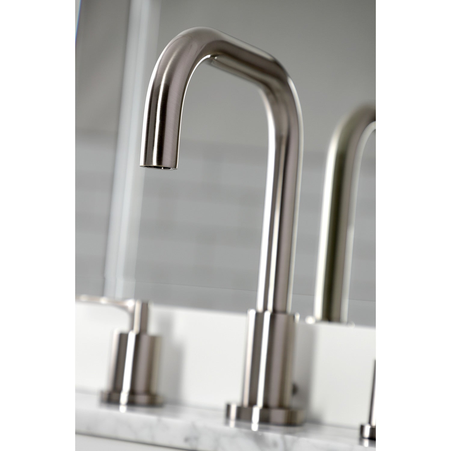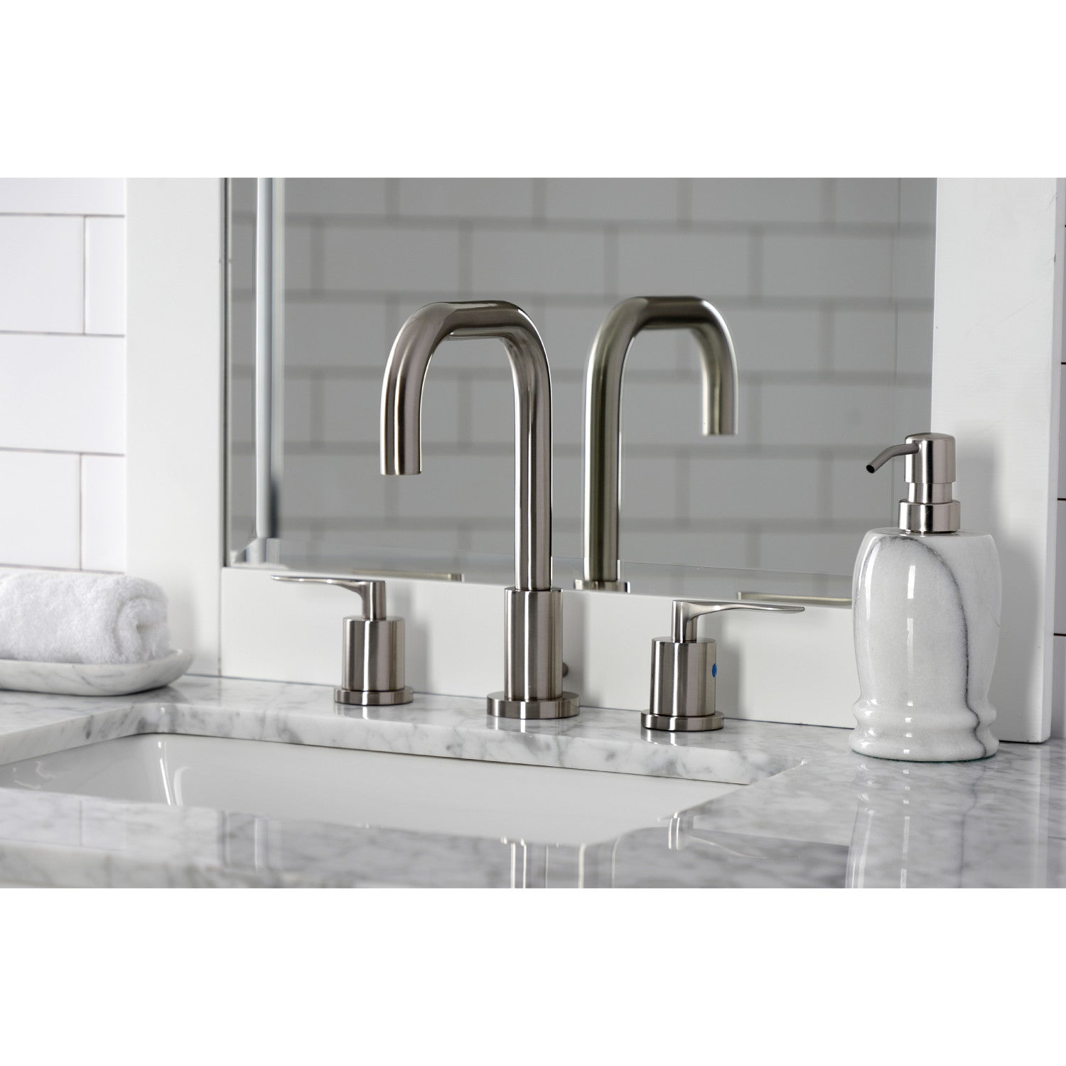 This faucet's modern features create a bold and edgy design in your bathroom. Ideal for more spacious bathrooms, widespread faucets are more spread apart and feature a 3-hole installation. The Serena widespread bathroom faucet and its featured sturdy brass construction and premium brushed nickel finish are guaranteed to glamorize your home's modern ensemble for years to come. A matching finish drain is also included.