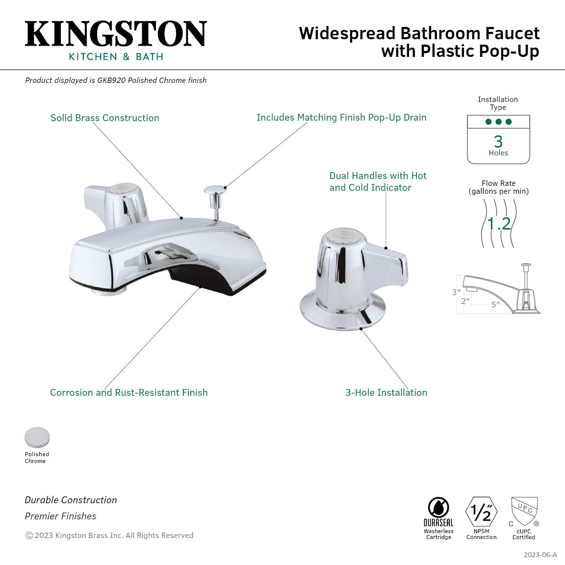• 1.2 GPM/4.5 LPM spout flow rate at 60 PSI