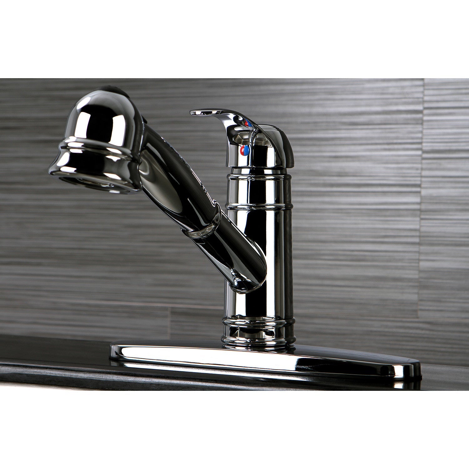 The exquisite design of this faucet tastefully flatters the elegant architecture of traditional homes with its fine detailing. An excellent options for smaller kitchens, the angled spout and extendable hose reach provide an optimized use of space. Minimalist design along with a classic style help you tackle your tough messes with the Eden Pull-Out Kitchen Faucet's two-function sprayer. The brass construction and single handle also provide a sturdy, reliant, and easy to use fixture. Matching accessories are available for use.