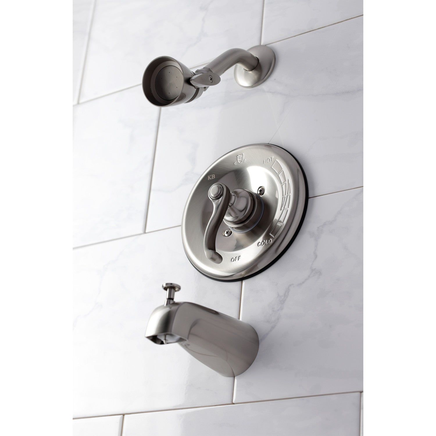 The exquisite design of this tub and shower faucet tastefully flatters the elegant architecture of traditional homes with its fine detailing. Complete with an easy-to-turn lever handle, an optimum bathing experience awaits. Enjoy the sturdy brass construction and premium brushed nickel finish for a fixture that will last for years to come. A pressure balanced valve is included for safety and protection against accidental burns.