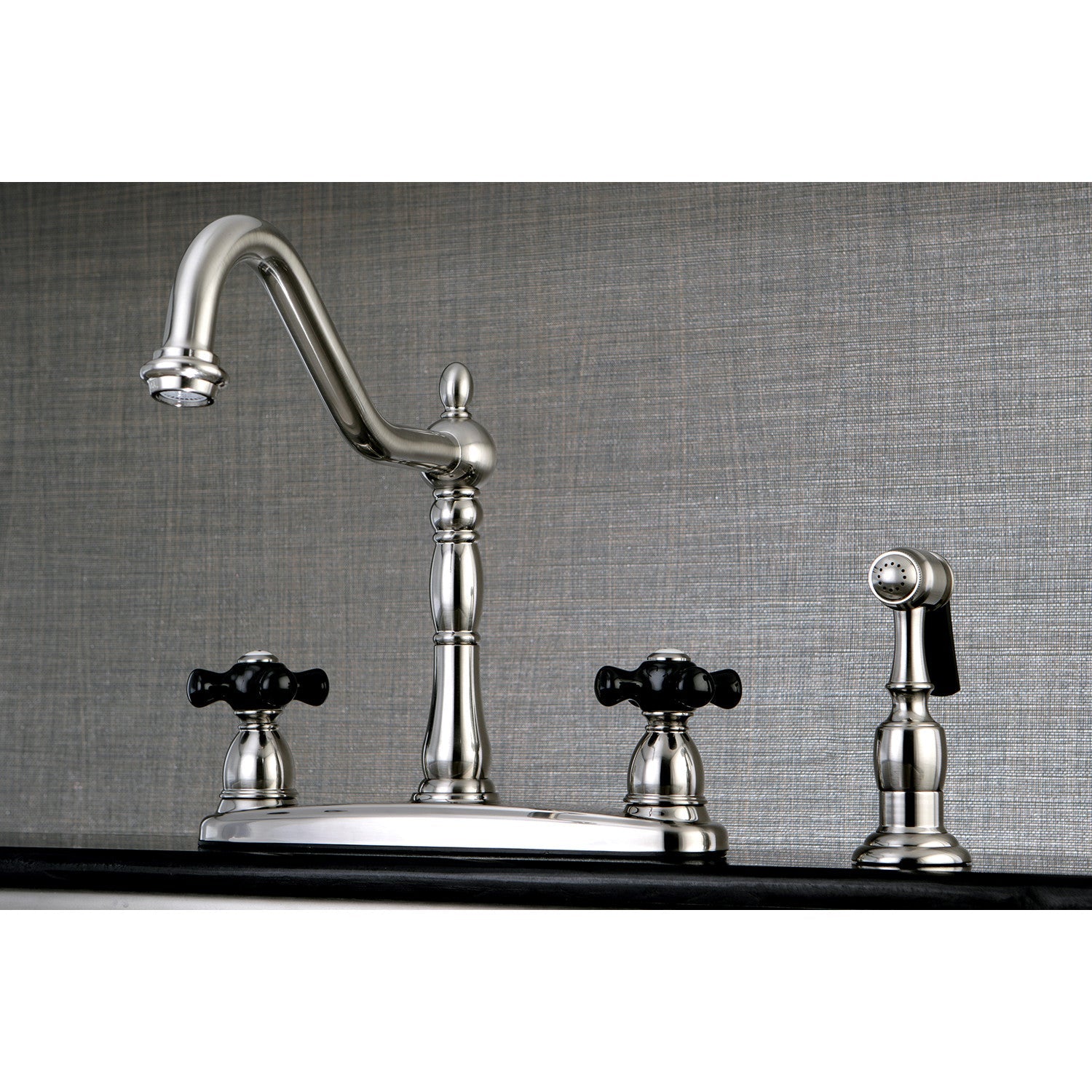 Crafted in commendations to English nobility, the exemplary design of this faucet manifests regality and elegance with its black porcelain handles. Easily adaptable to any style, centerset faucets are admired for their single unit and ease of installation. The brushed nickel finish will also provide a long lasting and warm touch to your kitchen ensemble. A sturdy brass construction and swivel abilities make for a reliant and long lasting fixture. Utilize the included matching finish side-sprayer for convenience in cleaning hard-to-reach areas.