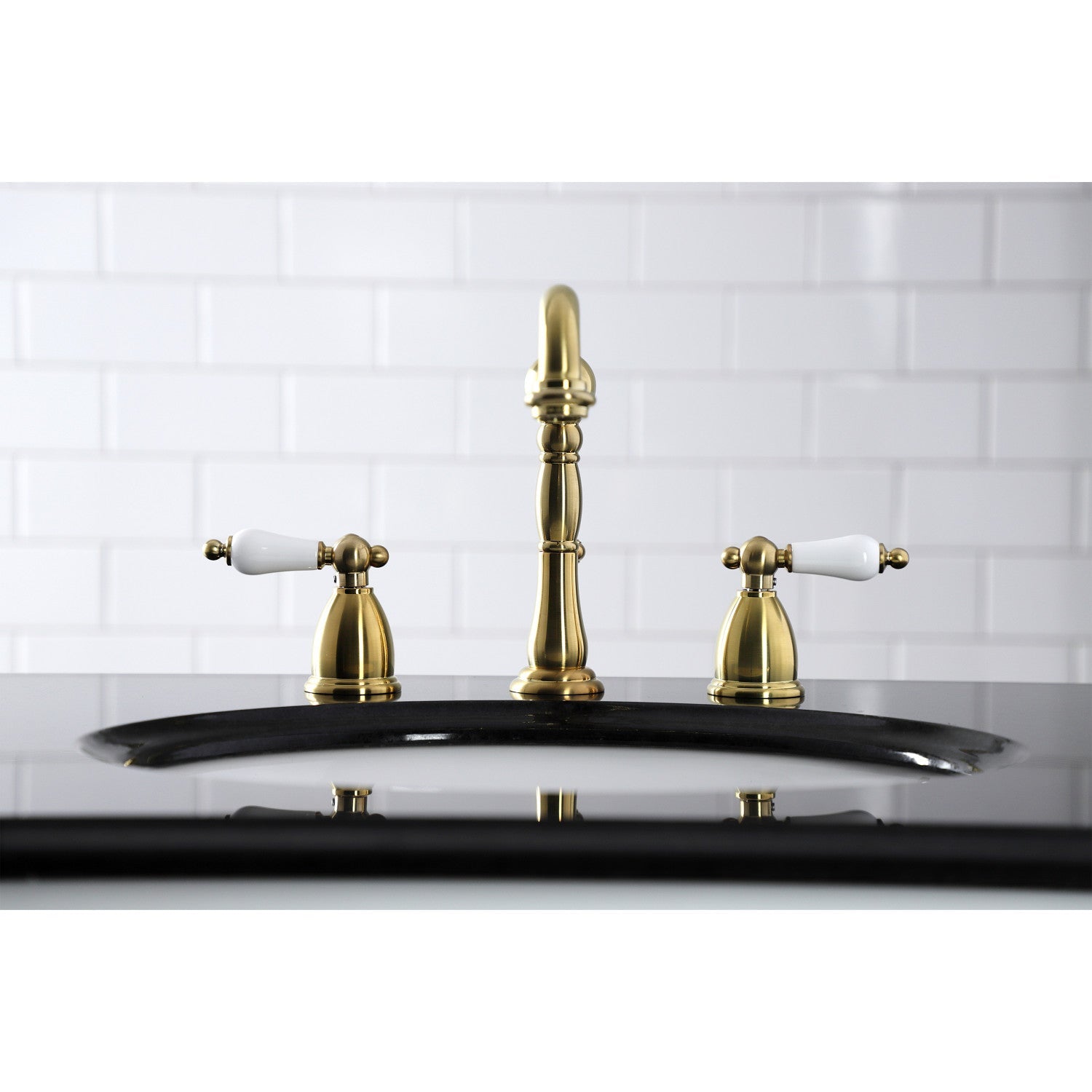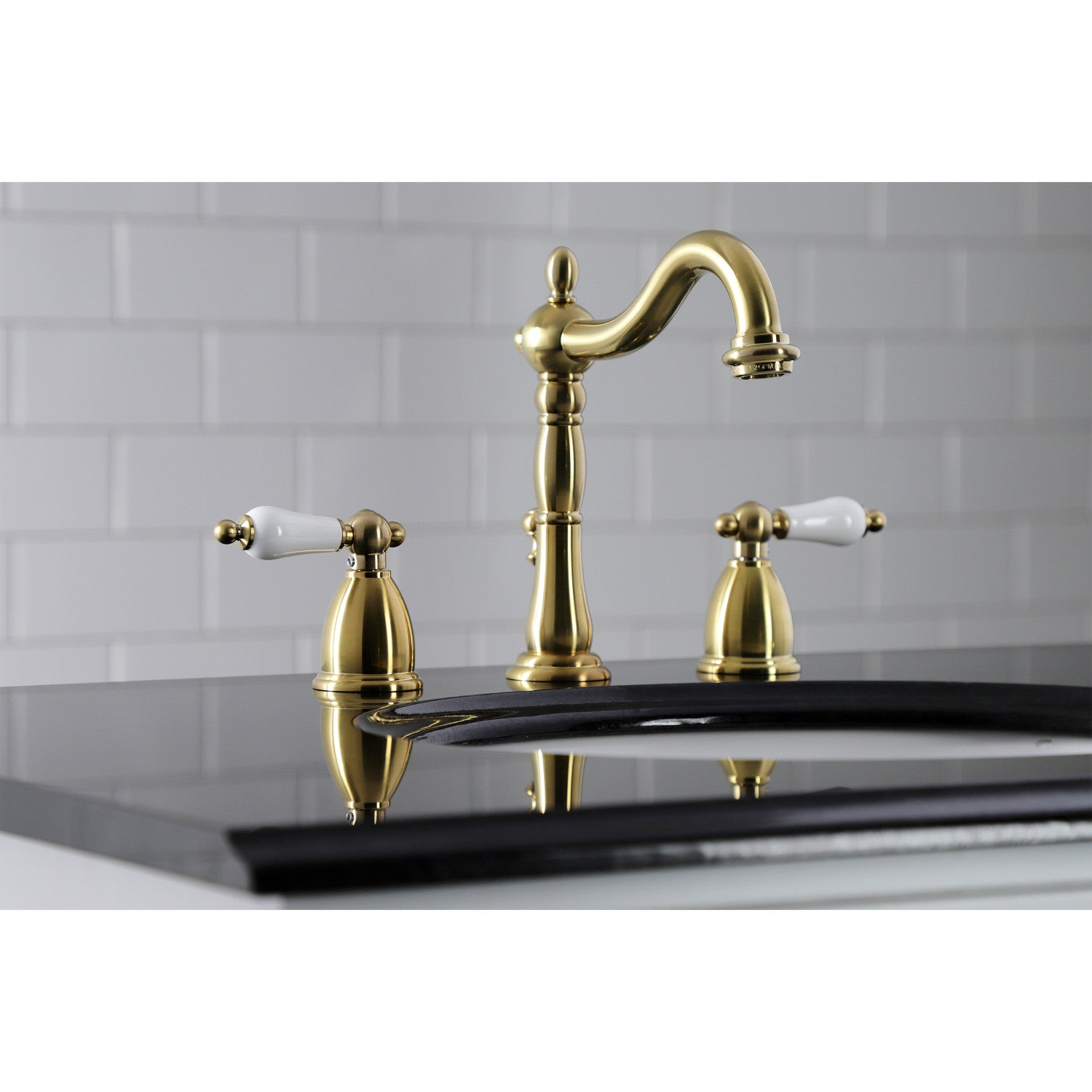 A lavish spark of traditionally stylized glamour is brought to your bathroom ensemble with this beautiful faucet. Ideal for more spacious bathrooms, widespread faucets are more spread apart and feature a 3-hole installation. The Heritage 8-inch widespread bathroom faucet and its featured sturdy brass construction and premium brushed brass finish are guaranteed to glamorize your home's traditional ensemble for years to come. Celebrate sophistication and traditional decor with this statement piece. A matching finish drain is also included.