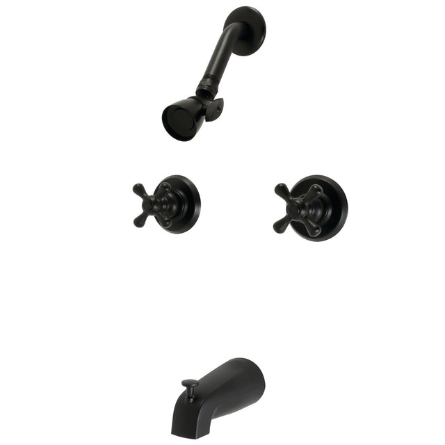 The timeless appeal of this tub and shower faucet's sleek and simple design transforms any bathroom into a destination location. Complete with easy-to-turn cross handles, an optimum bathing experience awaits. Enjoy the sturdy brass construction and premium matte black finish for a fixture that will last for years to come. Internal valve hardware is included for your use.