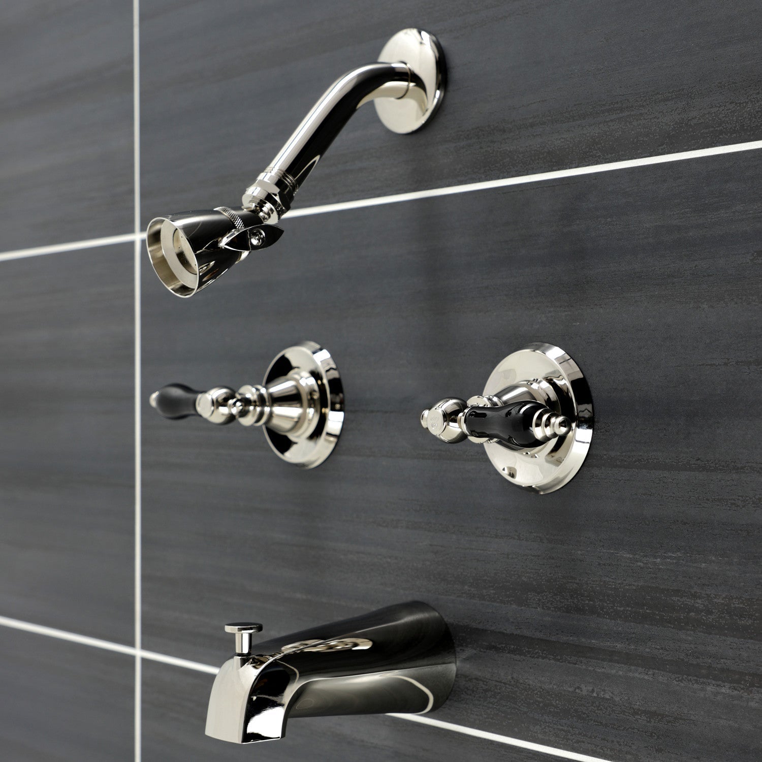 Crafted in commendation to English nobility, the simplistic design yet subtle details of this tub and shower faucet will upgrade your bathroom space. The black porcelain features subtly manifest regality and elegance. Complete with easy-to-turn lever handles, an optimum bathing experience awaits. Enjoy the sturdy brass construction and premium polished nickel finish for a fixture that will last for years to come. Internal valve hardware is included for your use.