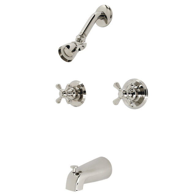 The timeless appeal of this tub and shower faucet's sleek and simple design transforms any bathroom into a destination location. Complete with easy-to-turn cross handles, an optimum bathing experience awaits. Enjoy the sturdy brass construction and premium polished nickel finish for a fixture that will last for years to come. Internal valve hardware is included for your use.