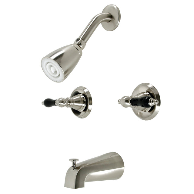 Crafted in commendation to English nobility, the simplistic design yet subtle details of this tub and shower faucet will upgrade your bathroom space. The black porcelain features subtly manifest regality and elegance. Complete with easy-to-turn lever handles, an optimum bathing experience awaits. Enjoy the sturdy brass construction and premium brushed nickel finish for a fixture that will last for years to come. Internal valve hardware is included for your use.