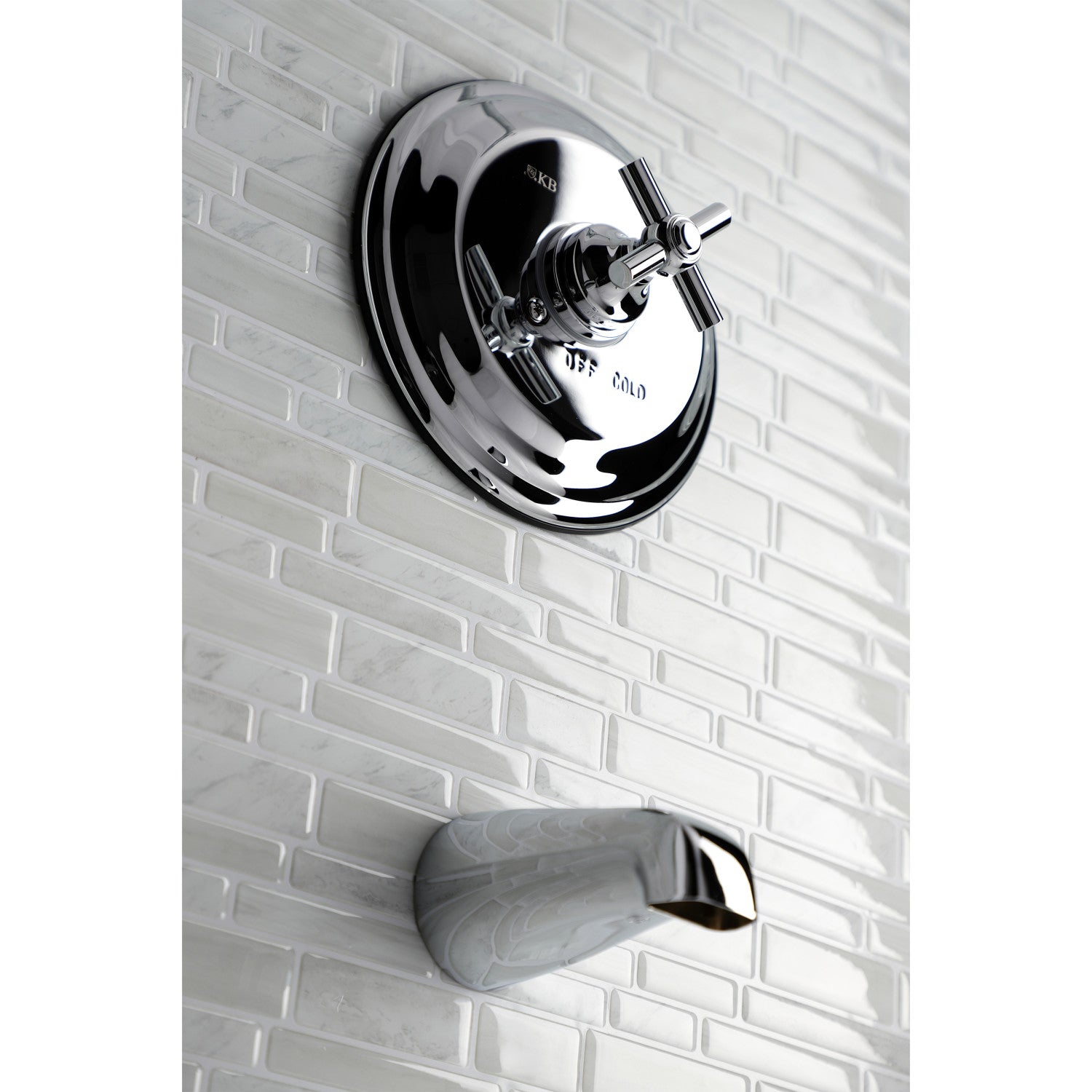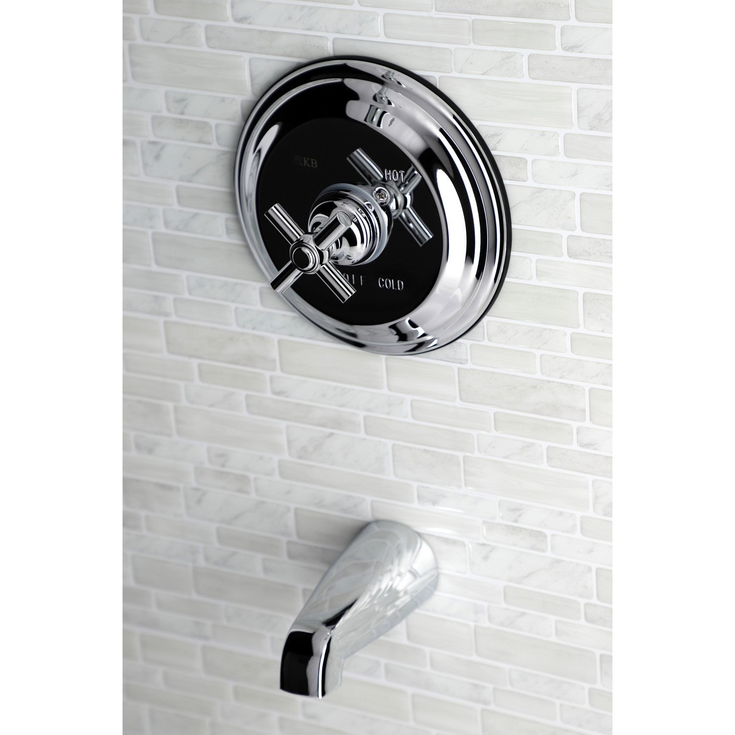 This tub and shower faucet's modern features create a bold and edgy design in your bathroom. Complete with an easy-to-turn cross handle, an optimum bathing experience awaits. Enjoy the sturdy brass construction and premium polished chrome finish for a fixture that will last for years to come. A pressure balanced valve is included for safety and protection against accidental burns.