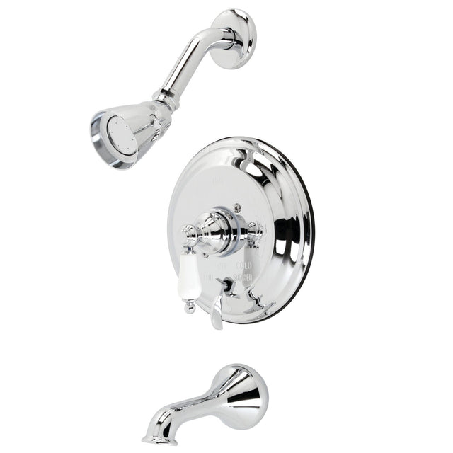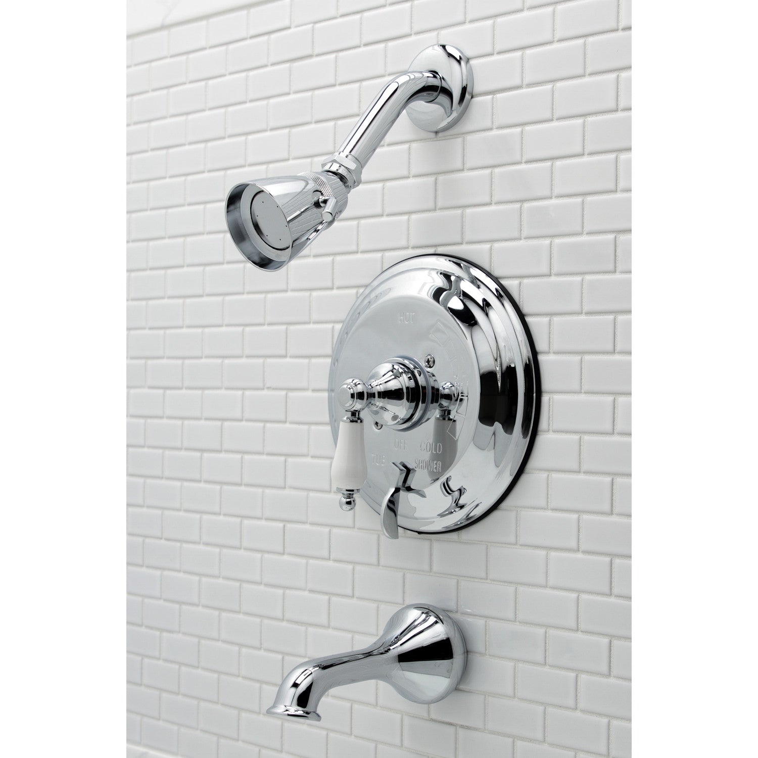 The traditional charm of this tub and shower faucet brings classical artistry to your home. Complete with an easy-to-turn lever handle, an optimum bathing experience awaits. Enjoy the sturdy brass construction and premium polished chrome finish for a fixture that will last for years to come. A pressure balanced valve is included for safety and protection against accidental burns.