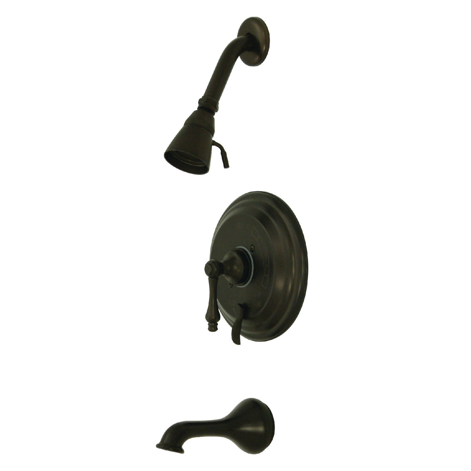 The traditional charm of this tub and shower faucet brings classical artistry to your home. Complete with an easy-to-turn lever handle, an optimum bathing experience awaits. Enjoy the sturdy brass construction and premium oil rubbed bronze finish for a fixture that will last for years to come. A pressure balanced valve is included for safety and protection against accidental burns.