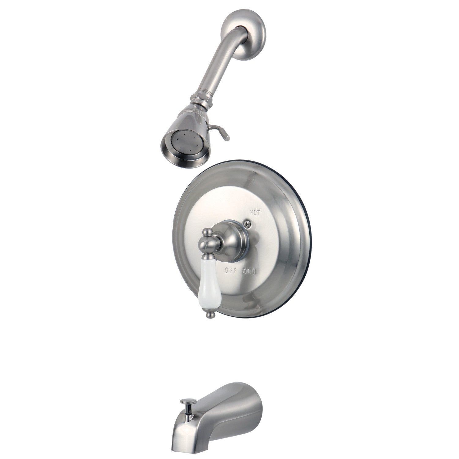 The traditional charm of this tub and shower faucet brings classical artistry to your home. Complete with an easy-to-turn lever handle, an optimum bathing experience awaits. Enjoy the sturdy brass construction and premium brushed nickel finish for a fixture that will last for years to come. A pressure balanced valve is included for safety and protection against accidental burns.