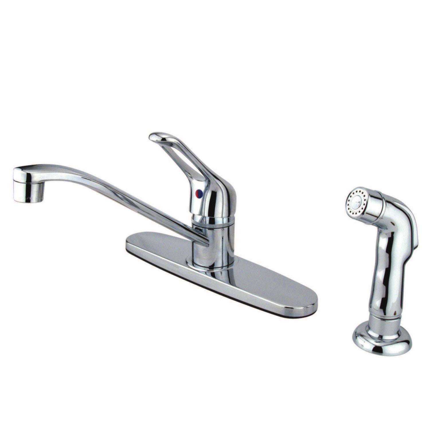 Seamlessly interweaving elements from both modern and classic design, this faucet embodies the finest design elements for a transitional styling, fitting any home decor. Easily adaptable to any style, centerset faucets are admired for their single unit and ease of installation. The polished chrome finish will also add a glistening elegance to your kitchen ensemble. A sturdy brass construction and swivel abilities make for a reliant and long lasting fixture. Utilize the included matching finish side-sprayer for convenience in cleaning hard-to-reach areas.
