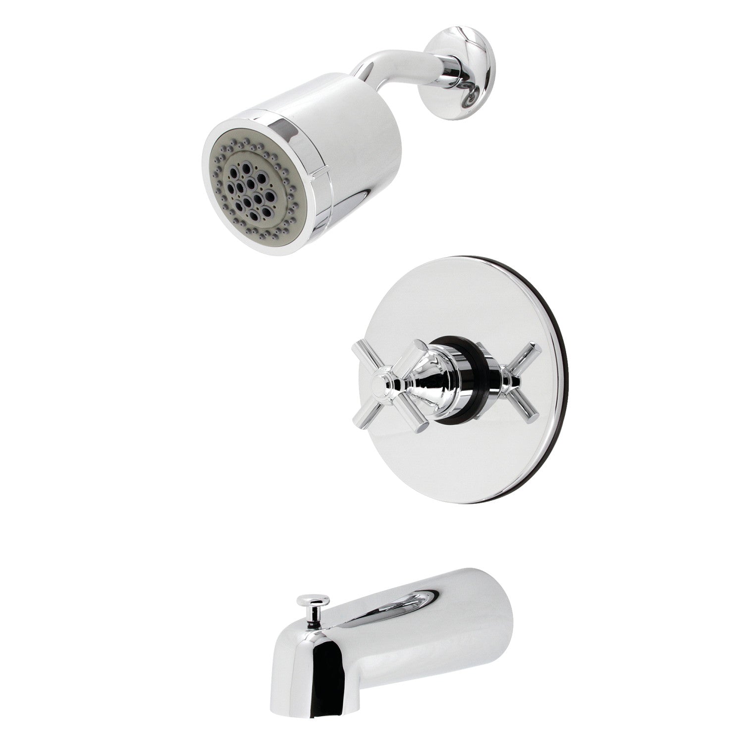 This tub and shower faucet's modern features create a bold and edgy design in your bathroom. Complete with an easy-to-turn cross handle, an optimum bathing experience awaits. Enjoy the sturdy brass construction and premium polished chrome finish for a fixture that will last for years to come. A pressure balanced valve is included for safety and protection against accidental burns.