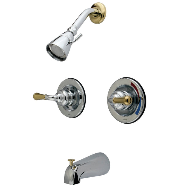The timeless appeal of this tub and shower faucet's sleek and simple design transforms any bathroom into a destination location. Complete with easy-to-turn lever handles, an optimum bathing experience awaits. Enjoy the sturdy brass construction and premium polished chrome/polished brass finishes for a fixture that will last for years to come. A pressure balanced valve is included for safety and protection against accidental burns.