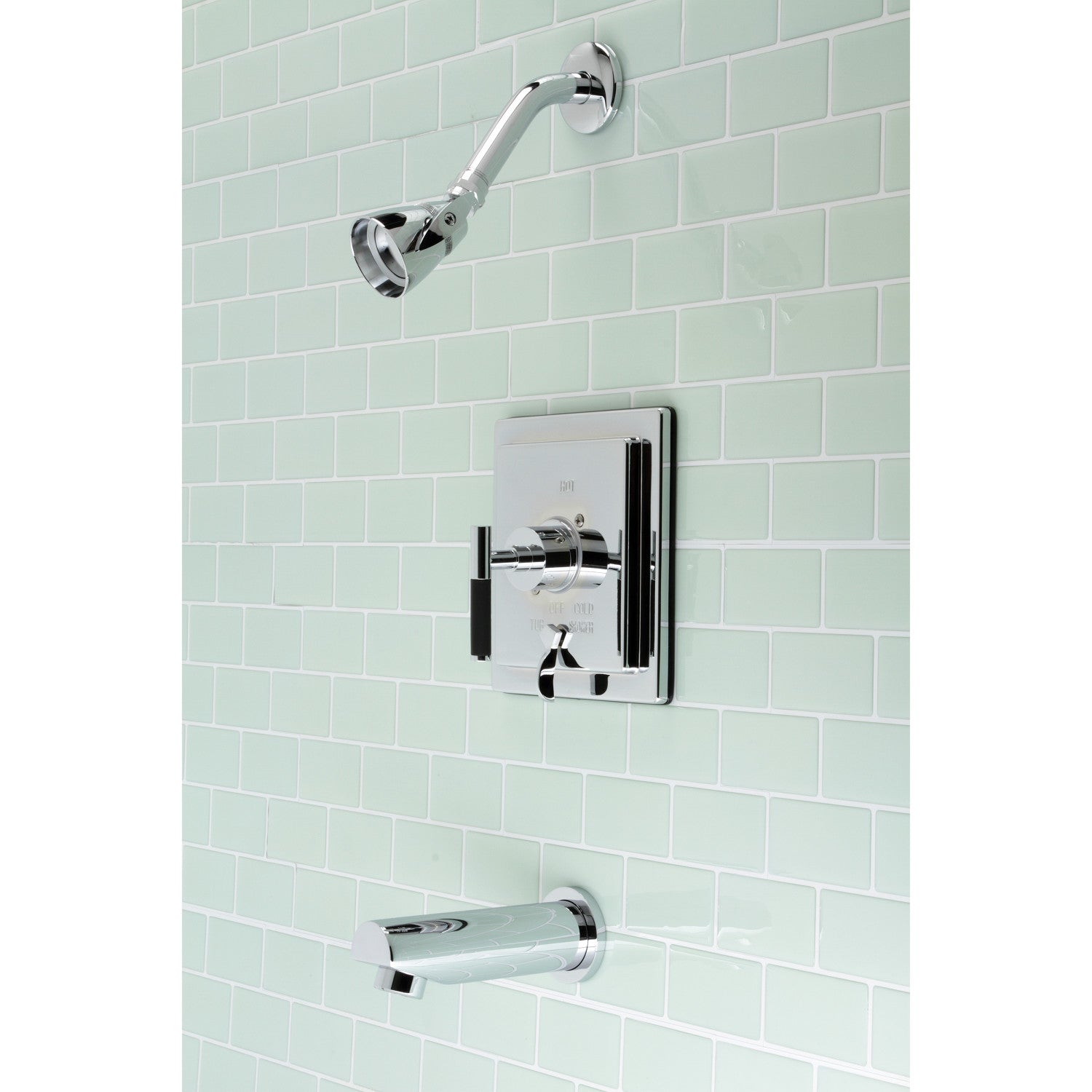 This tub and shower faucet tastefully interweaves top-notch ergonomic design and the sheen of contemporary simplicity with its black neoprene accents. Complete with an easy-to-turn lever handle, an optimum bathing experience awaits. Enjoy the sturdy brass construction and premium polished chrome finish for a fixture that will last for years to come. A pressure balanced valve is included for safety and protection against accidental burns.
