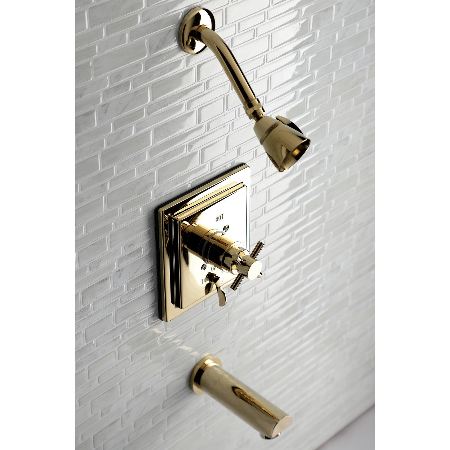 This tub and shower faucet's modern features create a bold and edgy design in your bathroom. Complete with an easy-to-turn cross handle, an optimum bathing experience awaits. Enjoy the sturdy brass construction and premium polished brass finish for a fixture that will last for years to come. A pressure balanced valve is included for safety and protection against accidental burns.