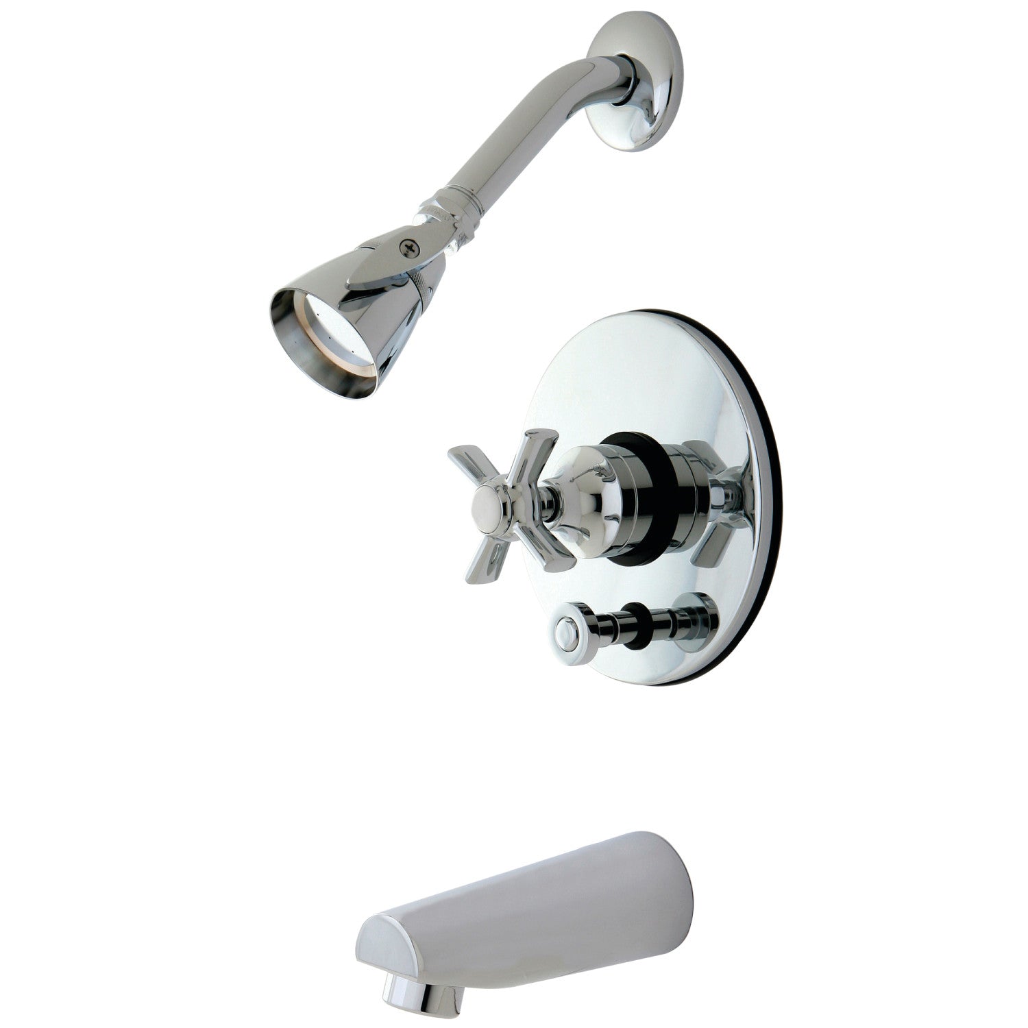 Integrating eclectic style in your home is easy with this tub and shower faucet's classical design. Complete with easy-to-turn cross handles, an optimum bathing experience awaits. Enjoy the sturdy brass construction and premium polished chrome finish for a fixture that will last for years to come. A pressure balanced valve is included for safety and protection against accidental burns.