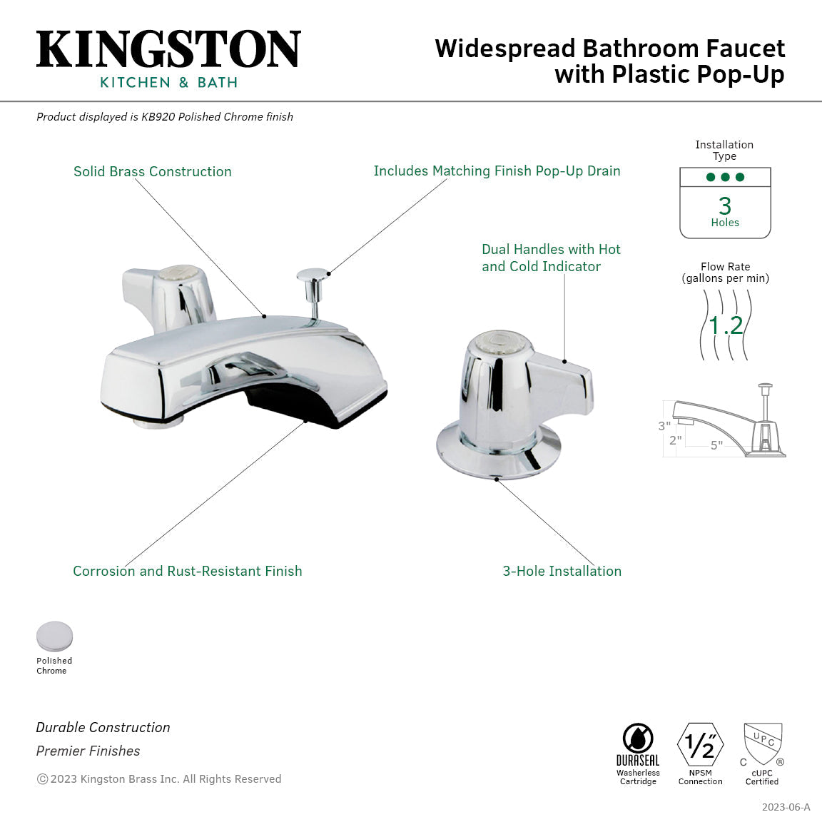 Americana KB920 Two-Handle 3-Hole Deck Mount Widespread Bathroom Faucet with Plastic Pop-Up, Polished Chrome