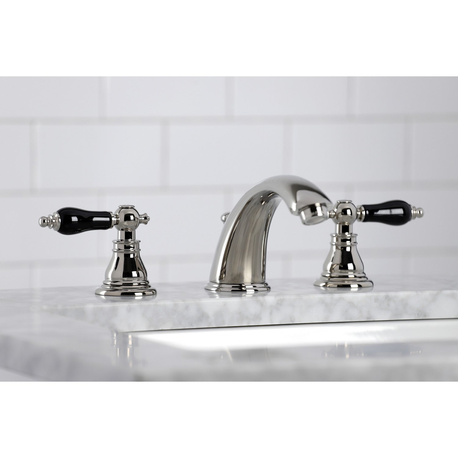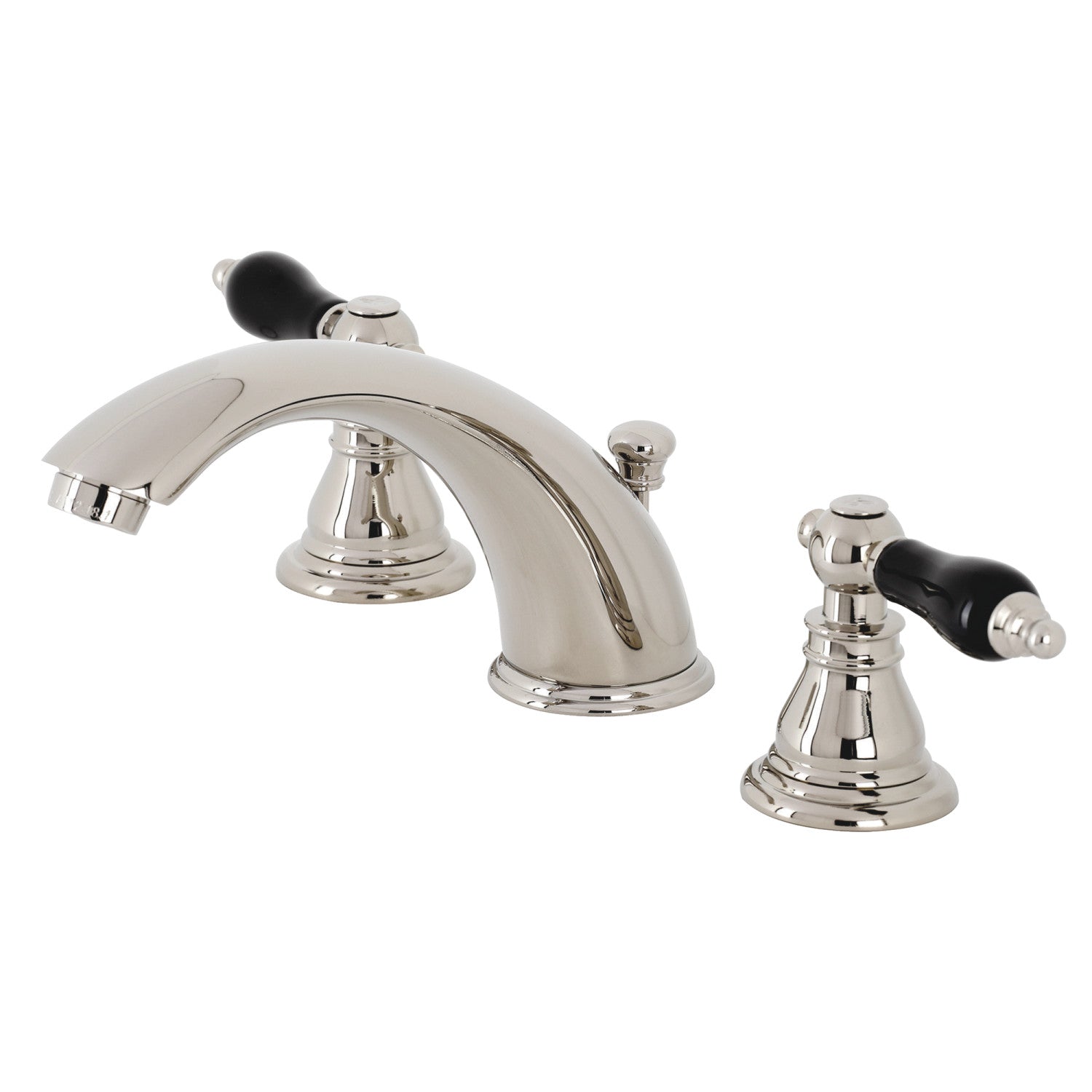 Crafted in commendations to English nobility, the exemplary design of this faucet manifests regality and elegance with its black porcelain handles. Ideal for more spacious bathrooms, widespread faucets are more spread apart and feature a 3-hole installation. The Duchess widespread bathroom faucet with pop-up drain and its featured sturdy brass construction and premium polished nickel finish are guaranteed to glamorize your home's traditional ensemble for years to come. Glamorize your home today with the traditional elegance of this faucet. A matching finish drain is also included.