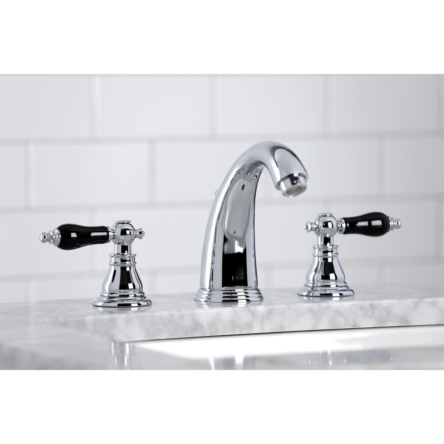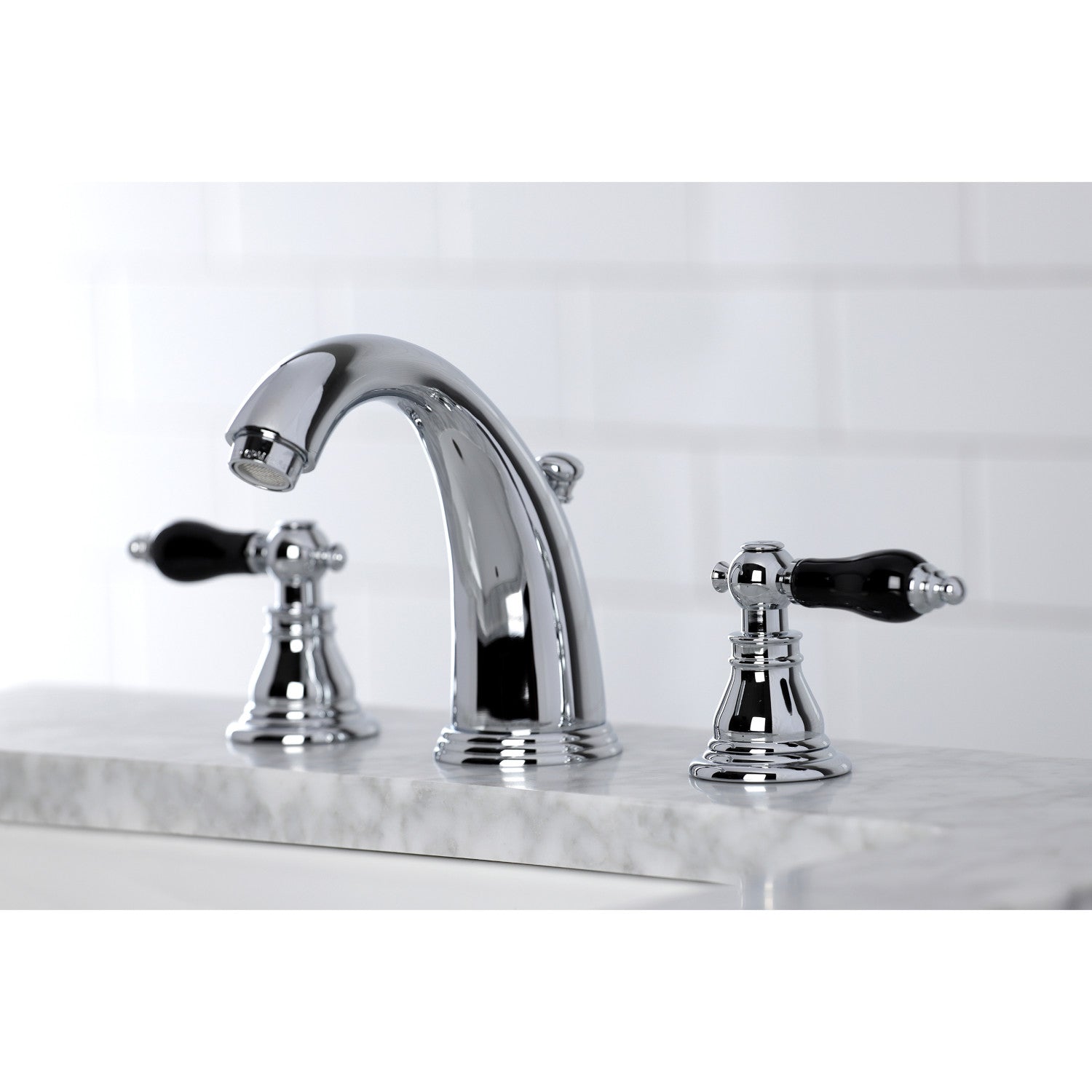 Crafted in commendations to English nobility, the exemplary design of this faucet manifests regality and elegance with its black porcelain handles. Ideal for more spacious bathrooms, widespread faucets are more spread apart and feature a 3-hole installation. The Duchess widespread bathroom faucet with pop-up drain and its featured sturdy brass construction and premium polished chrome finish are guaranteed to glamorize your home's traditional ensemble for years to come. Glamorize your home today with the traditional elegance of this faucet. A matching finish drain is also included.
