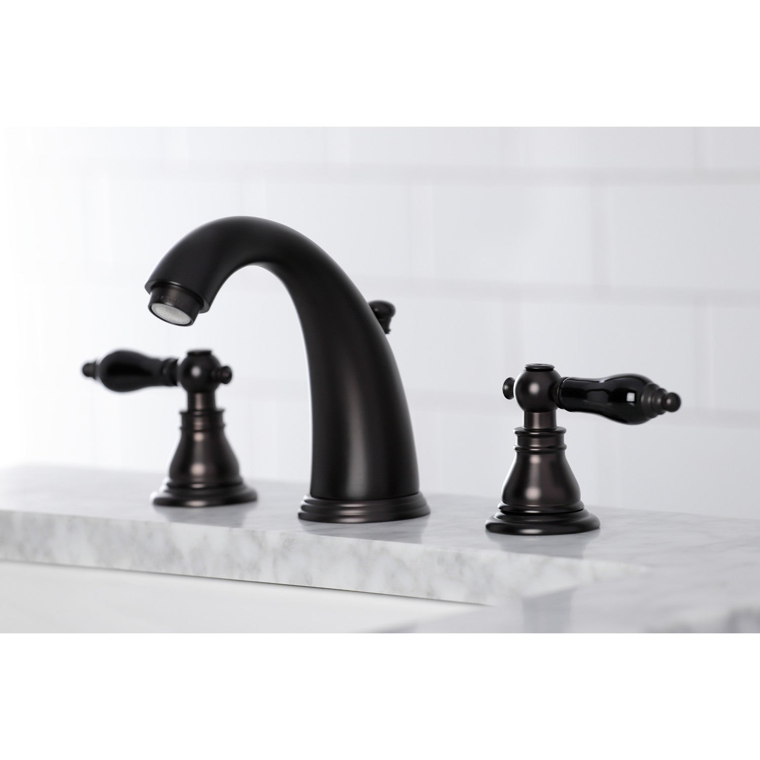 Crafted in commendations to English nobility, the exemplary design of this faucet manifests regality and elegance with its black porcelain handles. Ideal for more spacious bathrooms, widespread faucets are more spread apart and feature a 3-hole installation. The Duchess widespread bathroom faucet with pop-up drain and its featured sturdy brass construction and premium oil rubbed bronze finish are guaranteed to glamorize your home's traditional ensemble for years to come. Glamorize your home today with the traditional elegance of this faucet. A matching finish drain is also included.