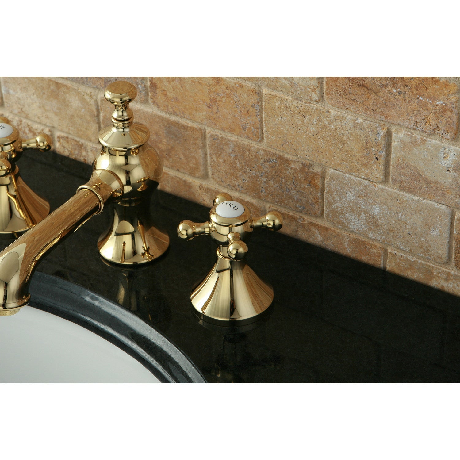 English Country KC7062BX Two-Handle 3-Hole Deck Mount Widespread Bathroom Faucet with Brass Pop-Up, Polished Brass