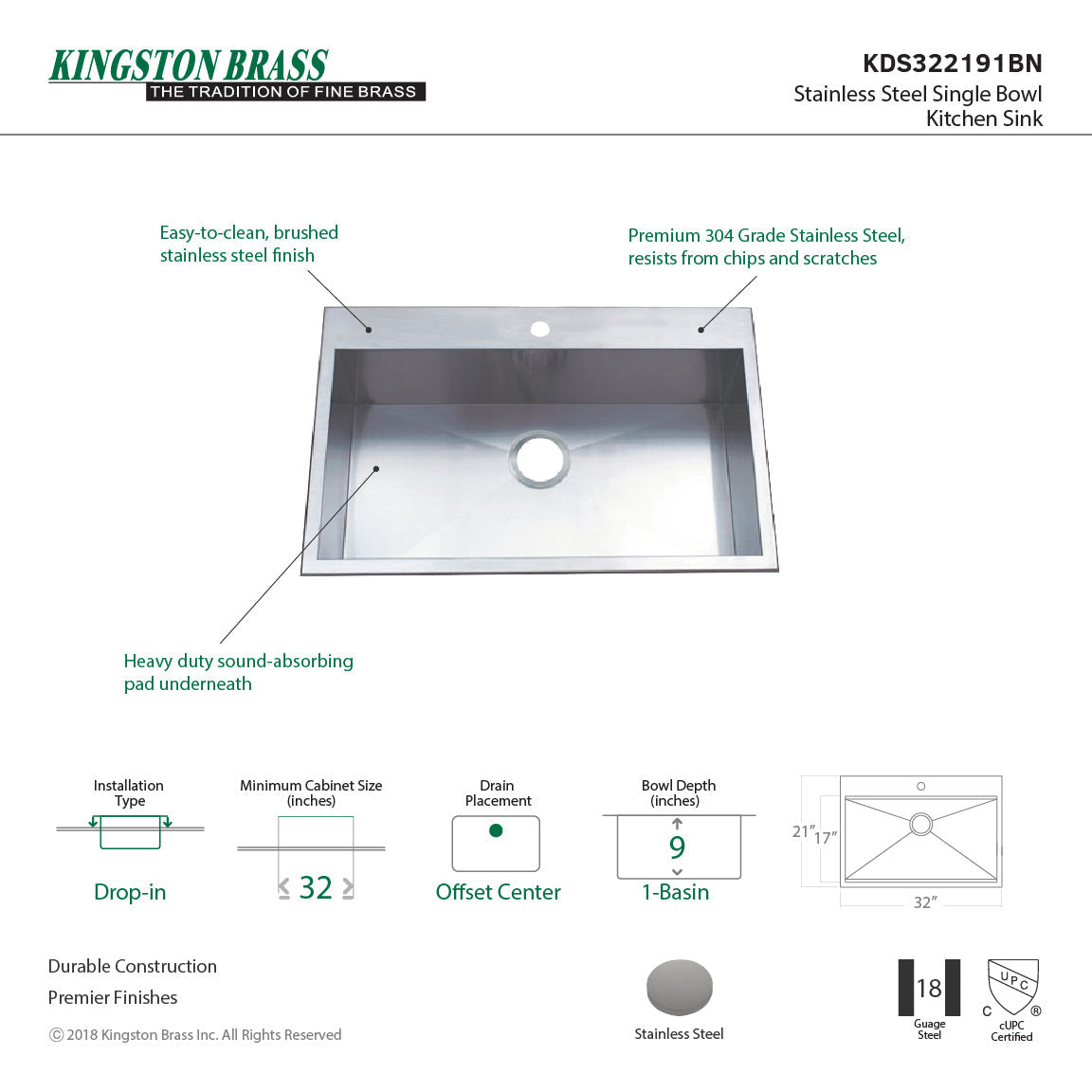 Uptowne KDS322191BN 31.5-Inch Stainless Steel Self-Rimming 1-Hole Single Bowl Drop-In Kitchen Sink, Brushed