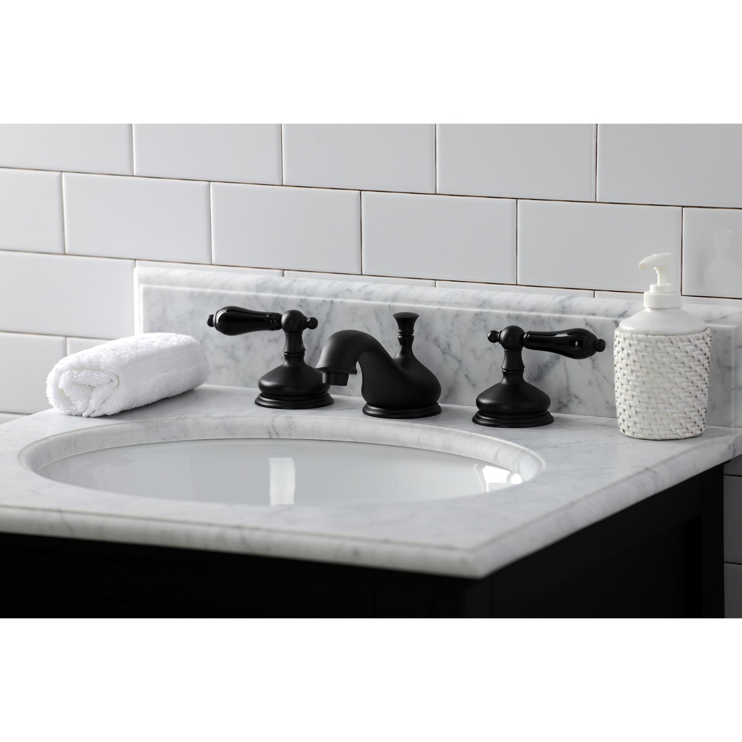 Crafted in commendations to English nobility, the exemplary design of this faucet manifests regality and elegance with its black porcelain handles. Ideal for more spacious bathrooms, widespread faucets are more spread apart and feature a 3-hole installation. The Duchess widespread bathroom faucet with brass pop-up and its featured sturdy brass construction and premium matte black finish are guaranteed to glamorize your home's traditional ensemble for years to come. Glamorize your home today with the traditional elegance of this faucet. A matching finish drain is also included.