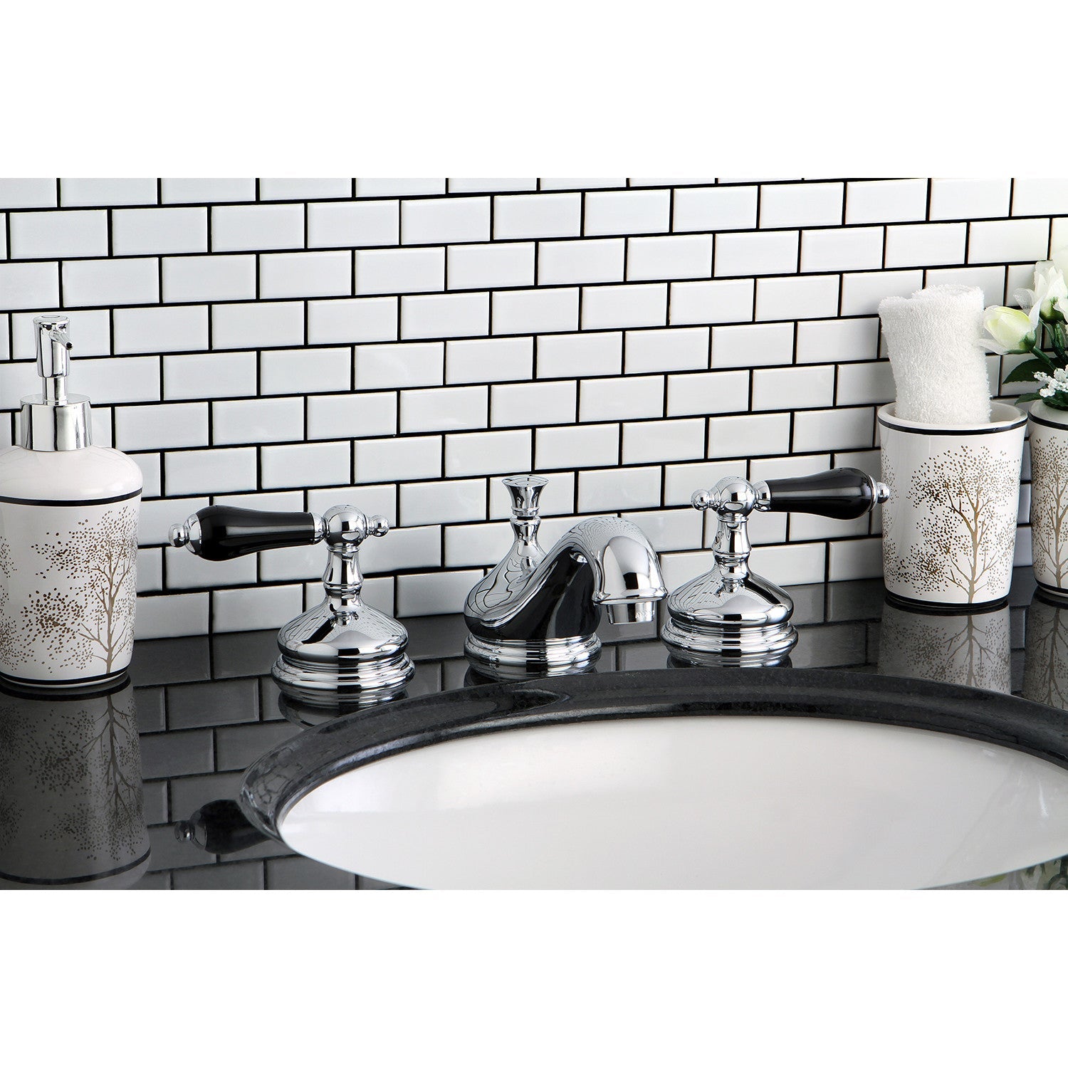 Crafted in commendations to English nobility, the exemplary design of this faucet manifests regality and elegance with its black porcelain handles. Ideal for more spacious bathrooms, widespread faucets are more spread apart and feature a 3-hole installation. The Duchess 8-inch widespread bathroom faucet with brass pop-up and its featured sturdy brass construction and premium polished chrome finish are guaranteed to glamorize your home's traditional ensemble for years to come. Glamorize your home today with the traditional elegance of this faucet. A matching finish drain is also included.