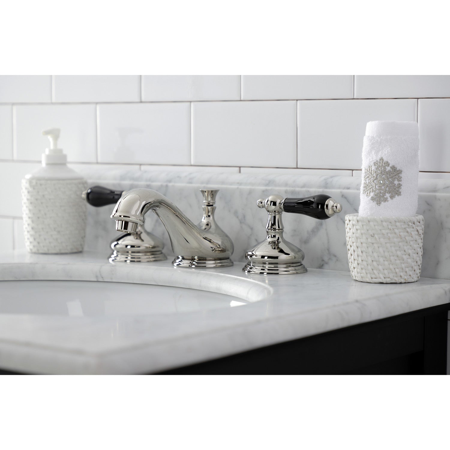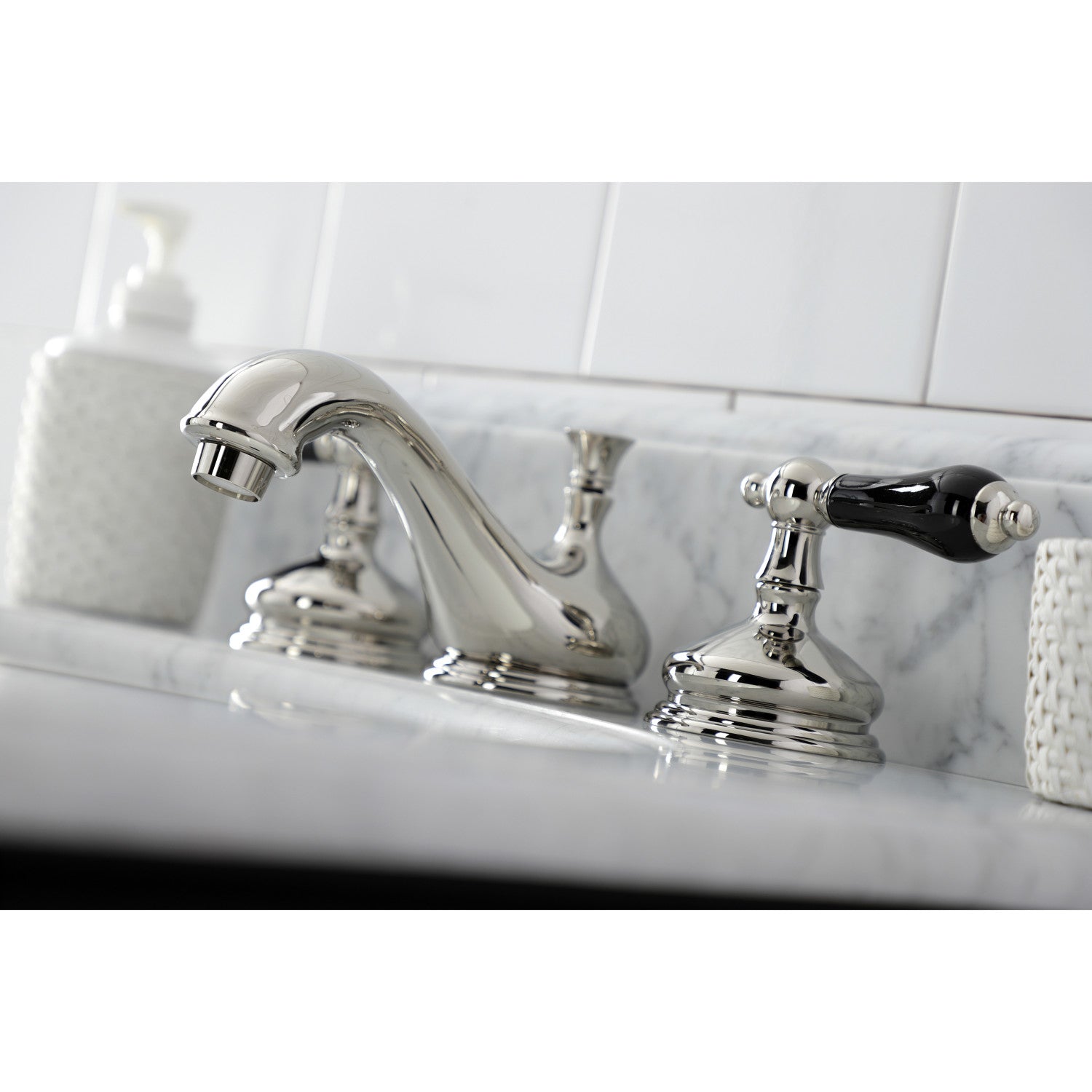 Crafted in commendations to English nobility, the exemplary design of this faucet manifests regality and elegance with its black porcelain handles. Ideal for more spacious bathrooms, widespread faucets are more spread apart and feature a 3-hole installation. The Duchess widespread bathroom faucet with brass pop-up and its featured sturdy brass construction and premium polished nickel finish are guaranteed to glamorize your home's traditional ensemble for years to come. Glamorize your home today with the traditional elegance of this faucet. A matching finish drain is also included.