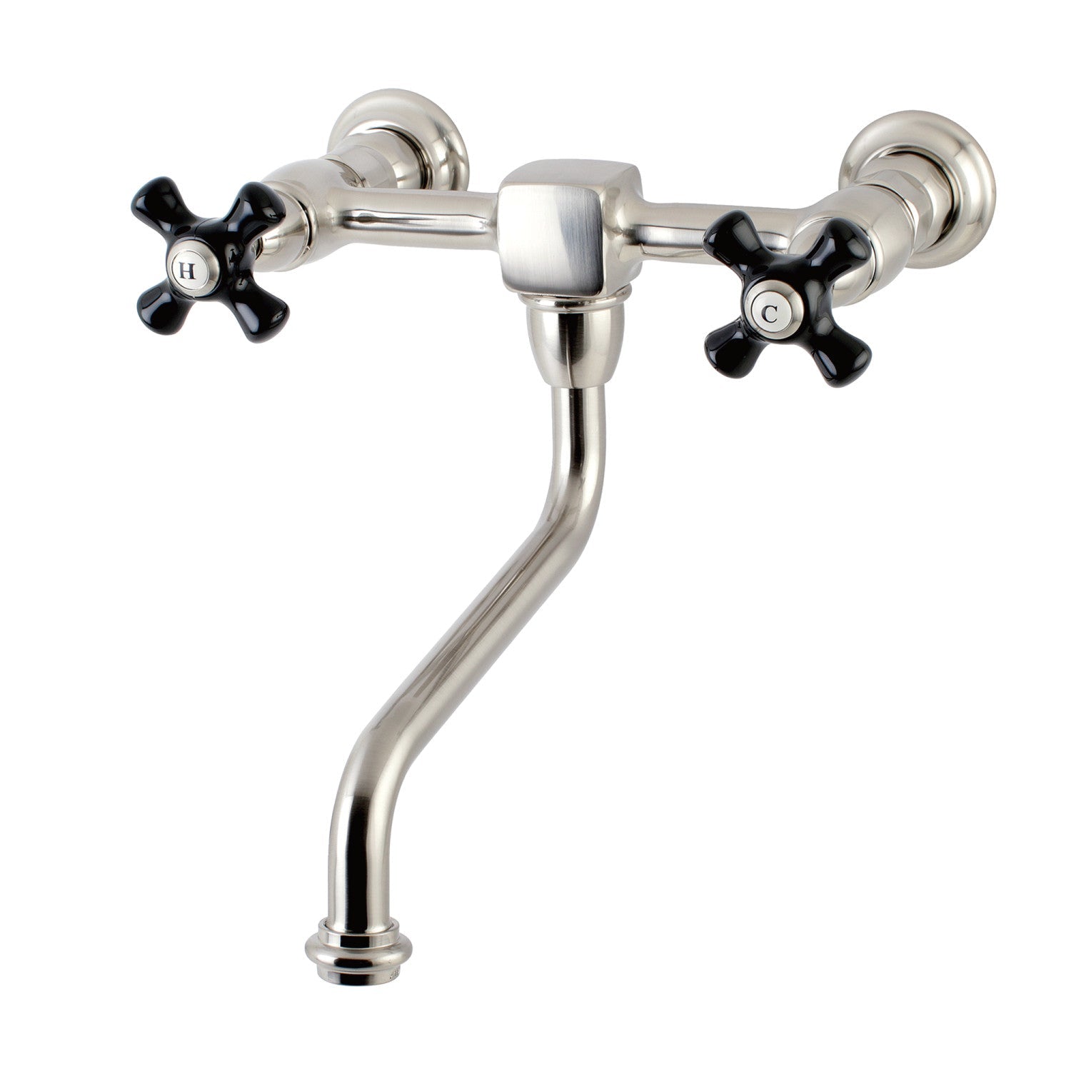 Crafted in commendations to English nobility, the exemplary design of this faucet manifests regality and elegance with its black porcelain handles. Attached to the wall behind your sink, the horizontal pop adds a stunning element to your bathroom design. Clean-up is also made a breeze as counter space is cleared up. The Duchess two handle wall mount bathroom faucet and its featured sturdy brass construction and premium brushed nickel finish are guaranteed to glamorize your home's traditional ensemble for years to come. Glamorize your home today with the traditional elegance of this faucet.