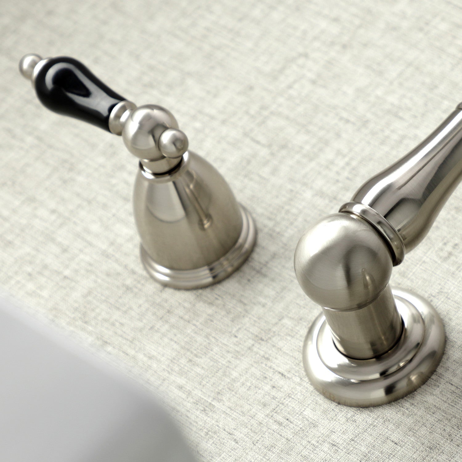 Crafted in commendations to English nobility, the exemplary design of this faucet manifests regality and elegance with its black porcelain handles. Attached to the wall behind your sink, the horizontal pop adds a stunning element to your bathroom design. Clean-up is also made a breeze as counter space is cleared up. The Duchess wall mount bathroom faucet and its featured sturdy brass construction and premium brushed nickel finish are guaranteed to glamorize your home's traditional ensemble for years to come. Glamorize your home today with the traditional elegance of this faucet.