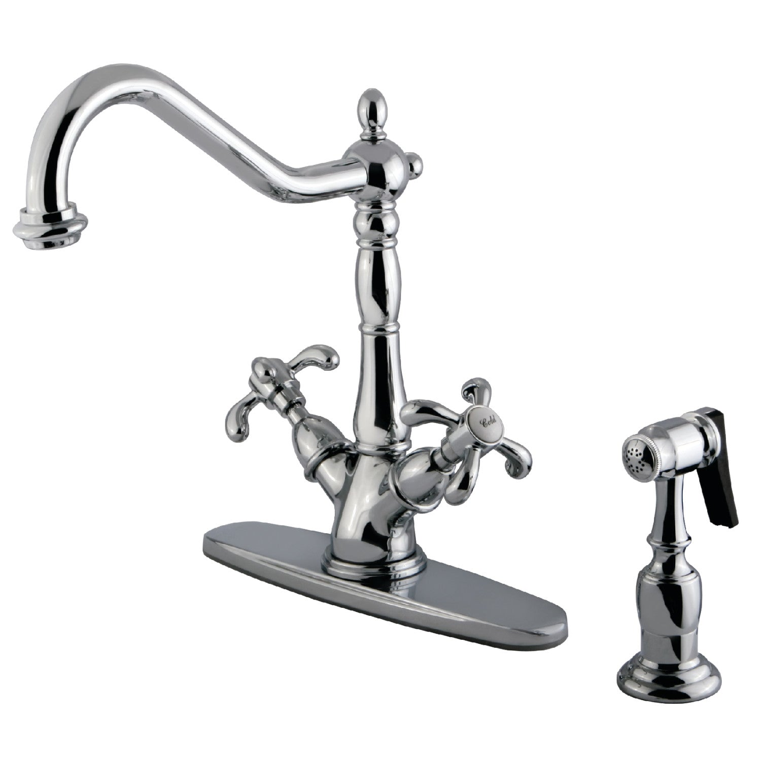 French Country KS1231TXBS Two-Handle 2-or-4 Hole Deck Mount Kitchen Faucet with Brass Sprayer, Polished Chrome