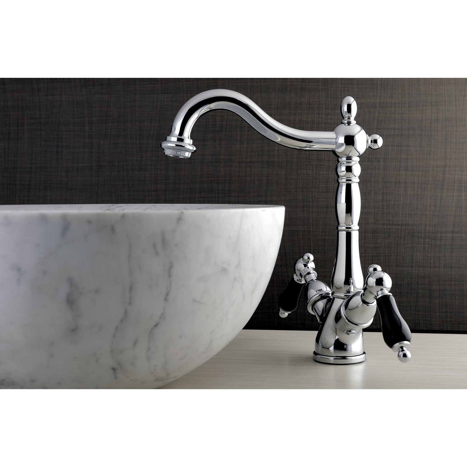 Crafted in commendations to English nobility, the exemplary design of this faucet manifests regality and elegance with its black porcelain handles. Kingston Brass vessel sink faucets perfectly complement the exquisite artistry of vessel sinks. Designed to handle the extra clearance needed for pairing with a vessel sink, this faucet boasts 8-1/4 inch of spout clearance. The Duchess Vessel Sink Faucet and its featured sturdy brass construction and premium polished chrome finish are guaranteed to glamorize your home's traditional ensemble for years to come. Glamorize your home today with the traditional elegance of this faucet.
