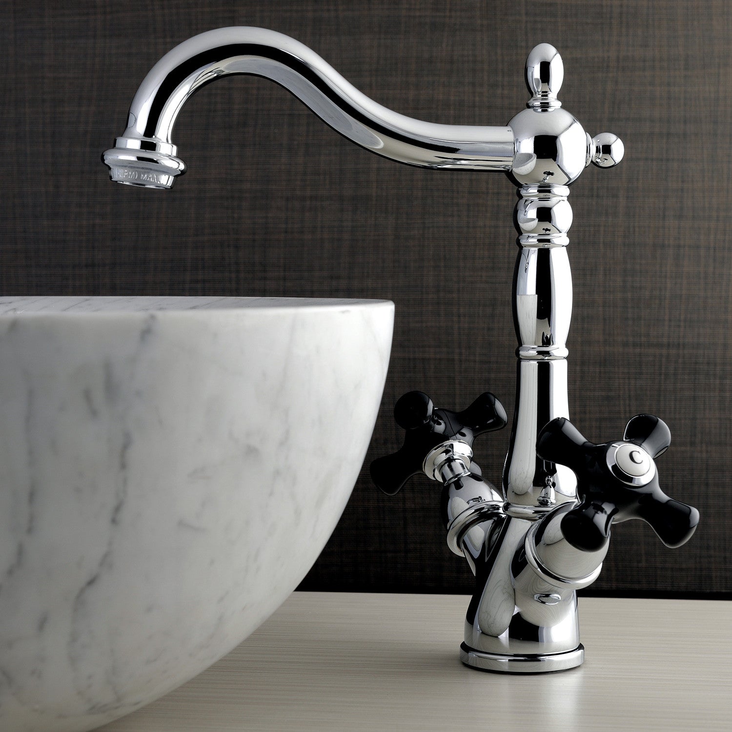 Crafted in commendations to English nobility, the exemplary design of this faucet manifests regality and elegance with its black porcelain handles. Kingston Brass vessel sink faucets perfectly complement the exquisite artistry of vessel sinks. Designed to handle the extra clearance needed for pairing with a vessel sink, this faucet boasts 8-1/4 inch of spout clearance. The Duchess Vessel Sink Faucet and its featured sturdy brass construction and premium polished chrome finish are guaranteed to glamorize your home's traditional ensemble for years to come. Glamorize your home today with the traditional elegance of this faucet.