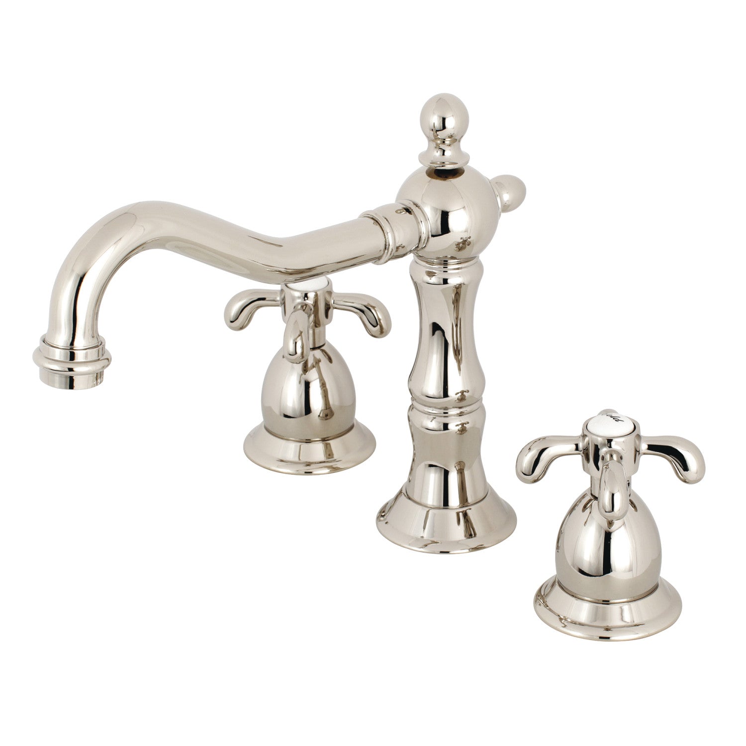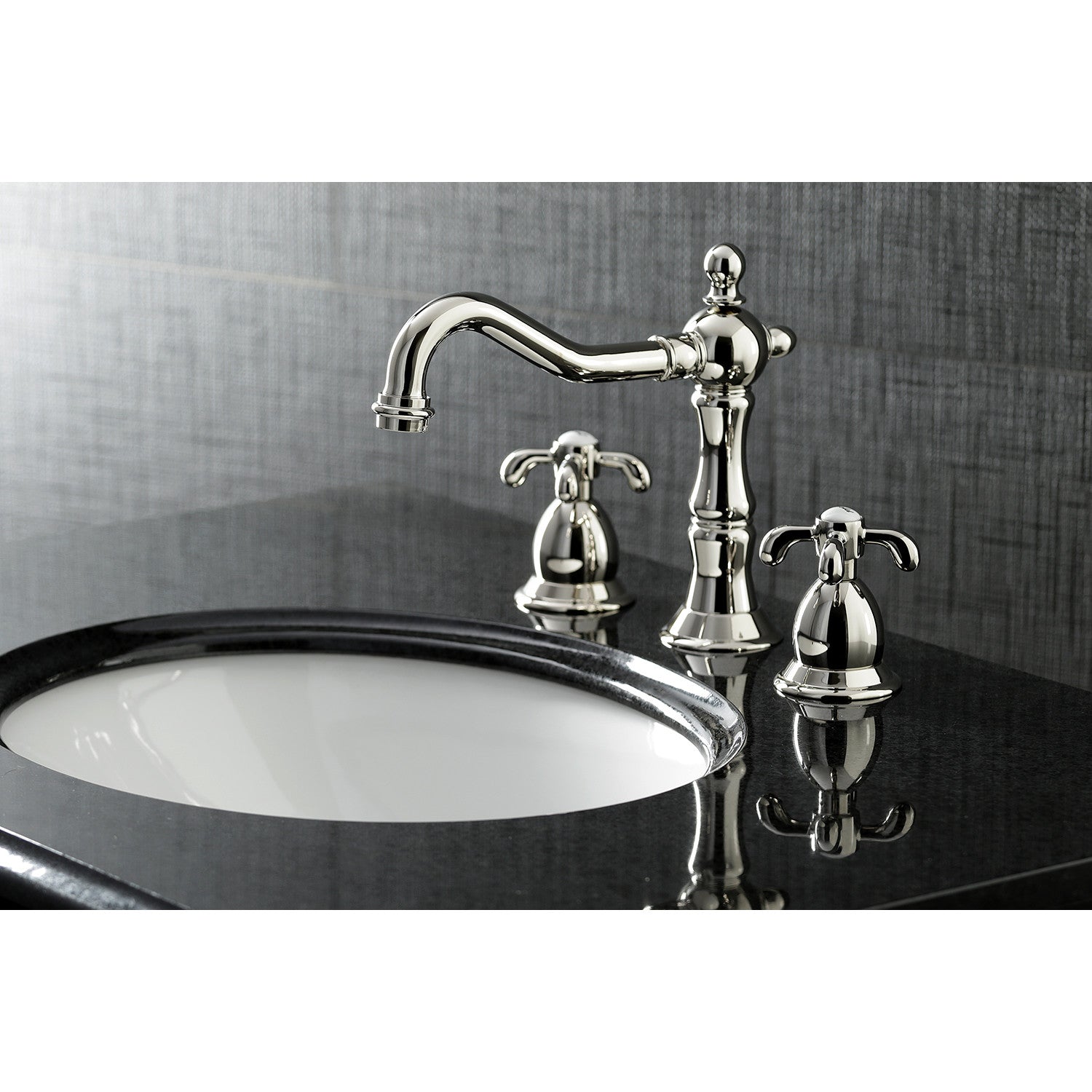 French Country KS1976TX Two-Handle 3-Hole Deck Mount Widespread Bathroom Faucet with Brass Pop-Up, Polished Nickel