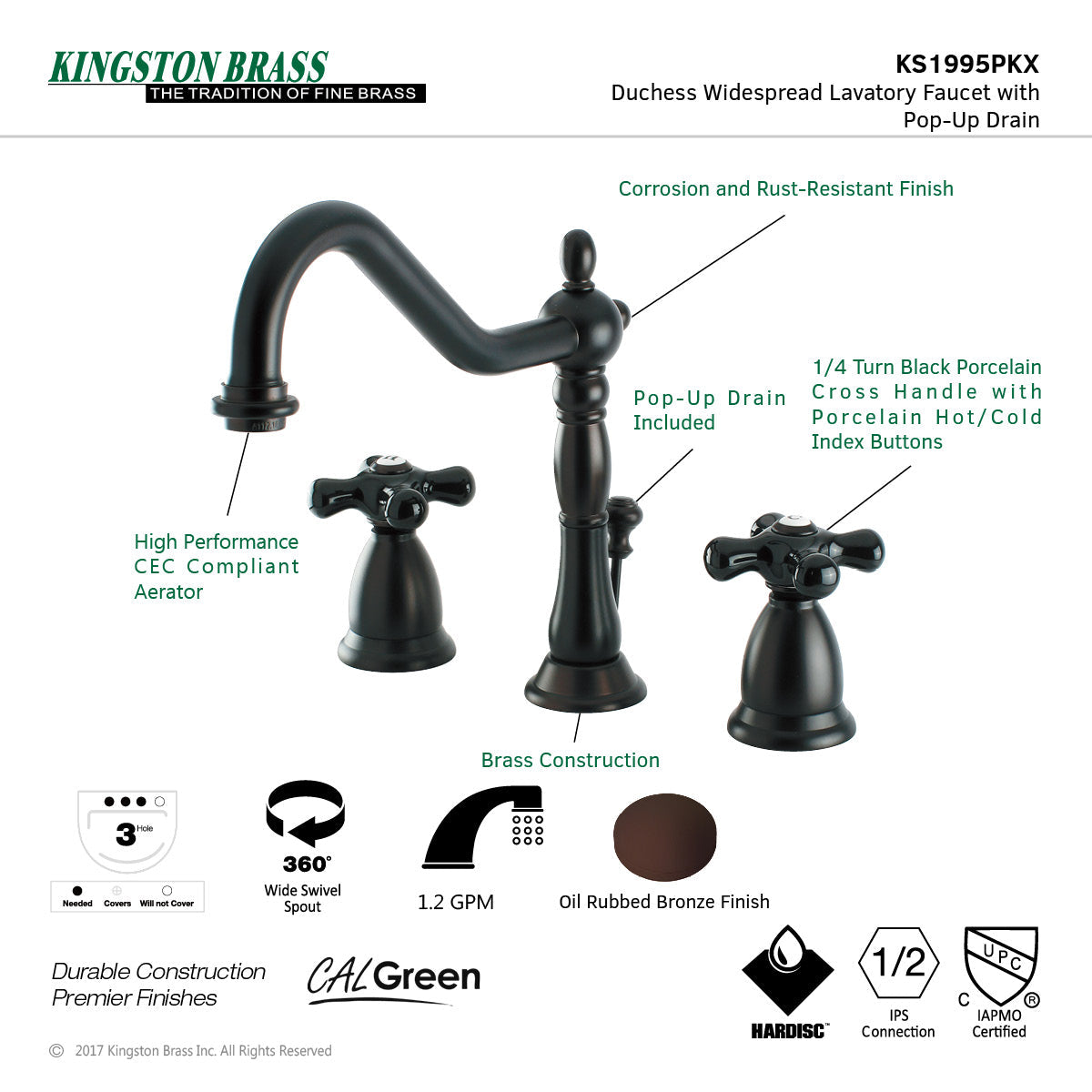 Crafted in commendations to English nobility, the exemplary design of this faucet manifests regality and elegance with its black porcelain handles. Ideal for more spacious bathrooms, widespread faucets are more spread apart and feature a 3-hole installation. The Duchess 8-inch widespread bathroom faucet with brass pop-up and its featured sturdy brass construction and premium oil rubbed bronze finish are guaranteed to glamorize your home's traditional ensemble for years to come. Glamorize your home today with the traditional elegance of this faucet. A matching finish drain is also included.