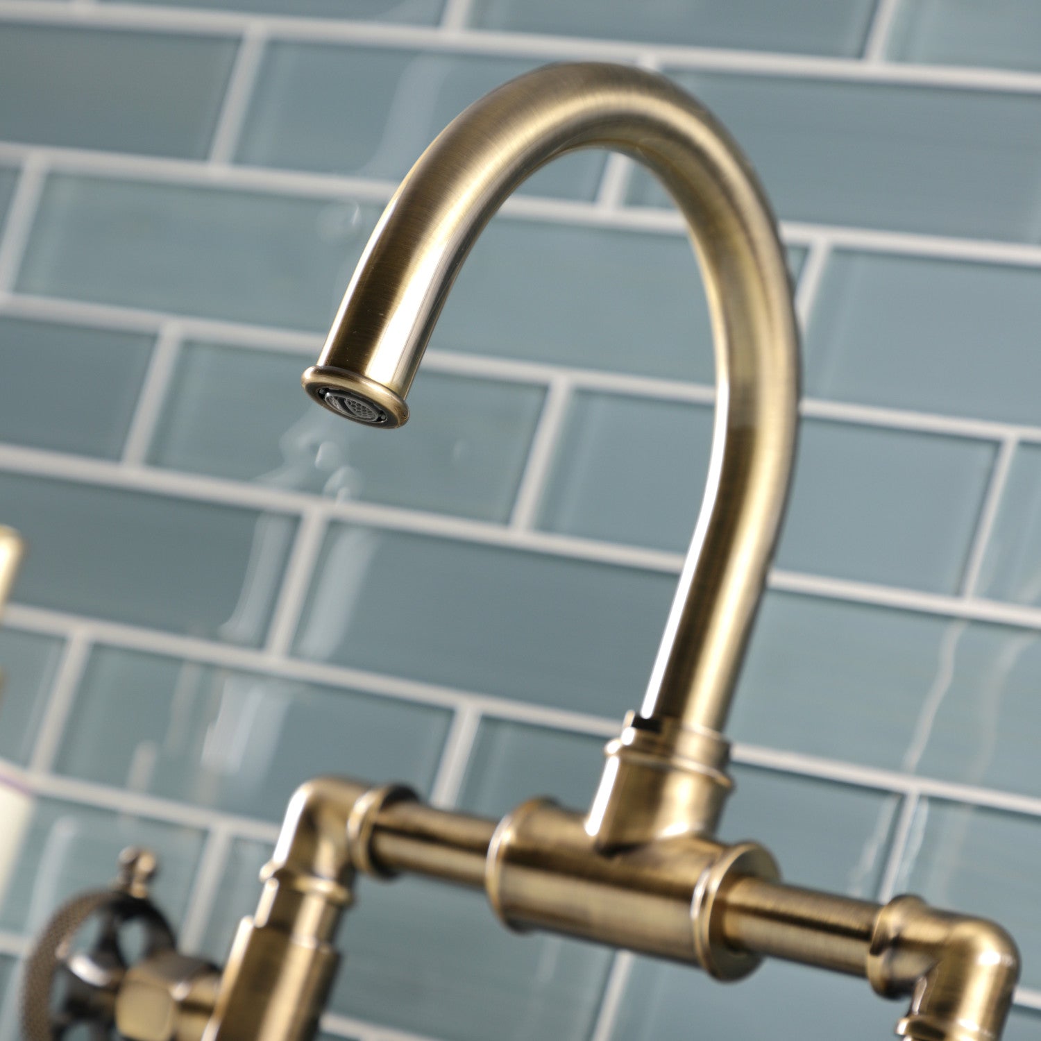 The exquisite design of this faucet tastefully flatters the elegant architecture of traditional homes with its fine detailing. Elegantly designed, the exquisite arch connecting the spout to the handles provides an added aesthetic appeal to make for more of a statement piece. Additionally, the 7-15/16 inch of spout clearance make for a very easy hand washing experience with plenty of room for other tasks. The Webb bridge bathroom faucet with push pop-up and its featured sturdy brass construction and premium antique brass finish are guaranteed to glamorize your home's traditional ensemble for years to come. A matching finish drain is also included.