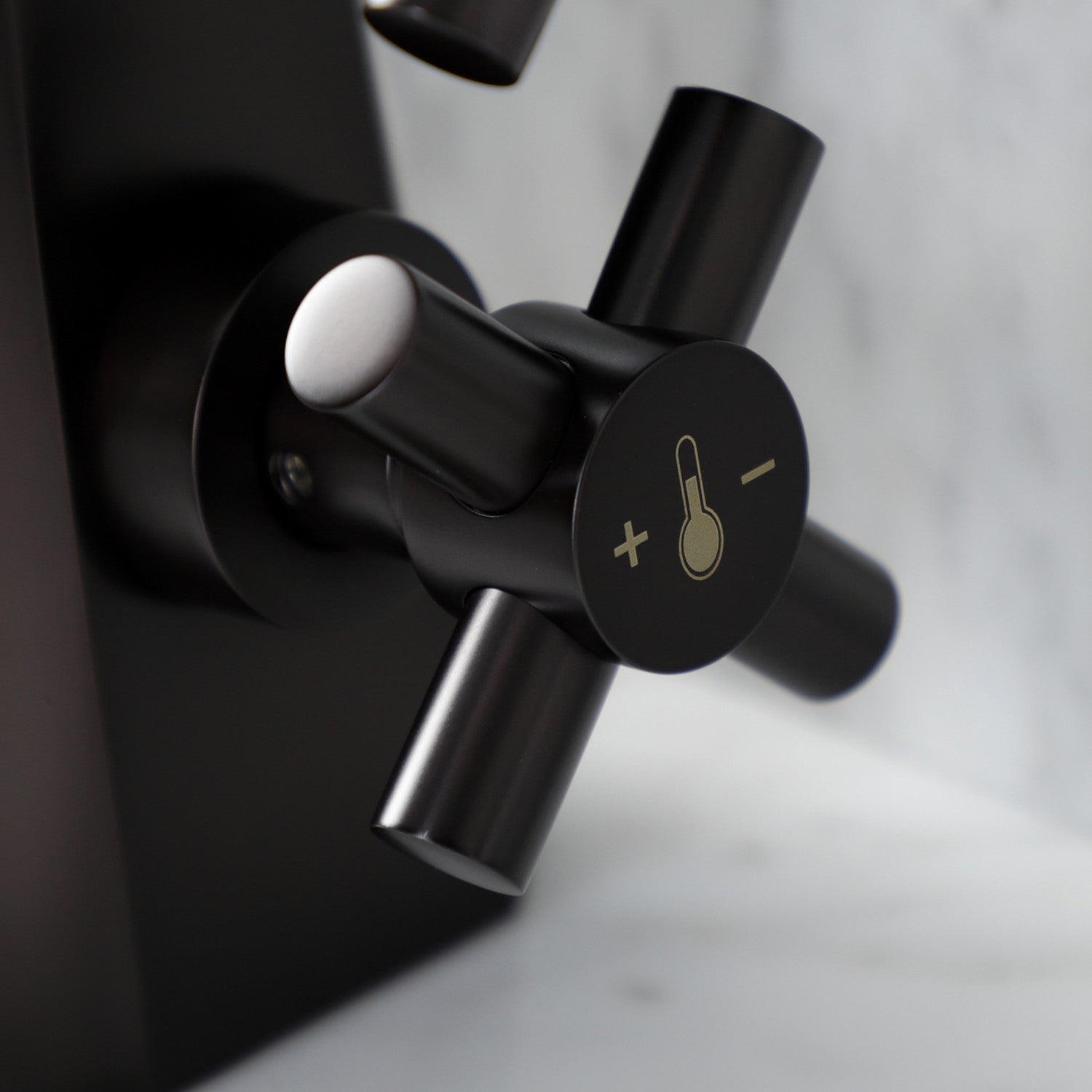 - Top handle controls water flow volume, bottom handle controls temperature